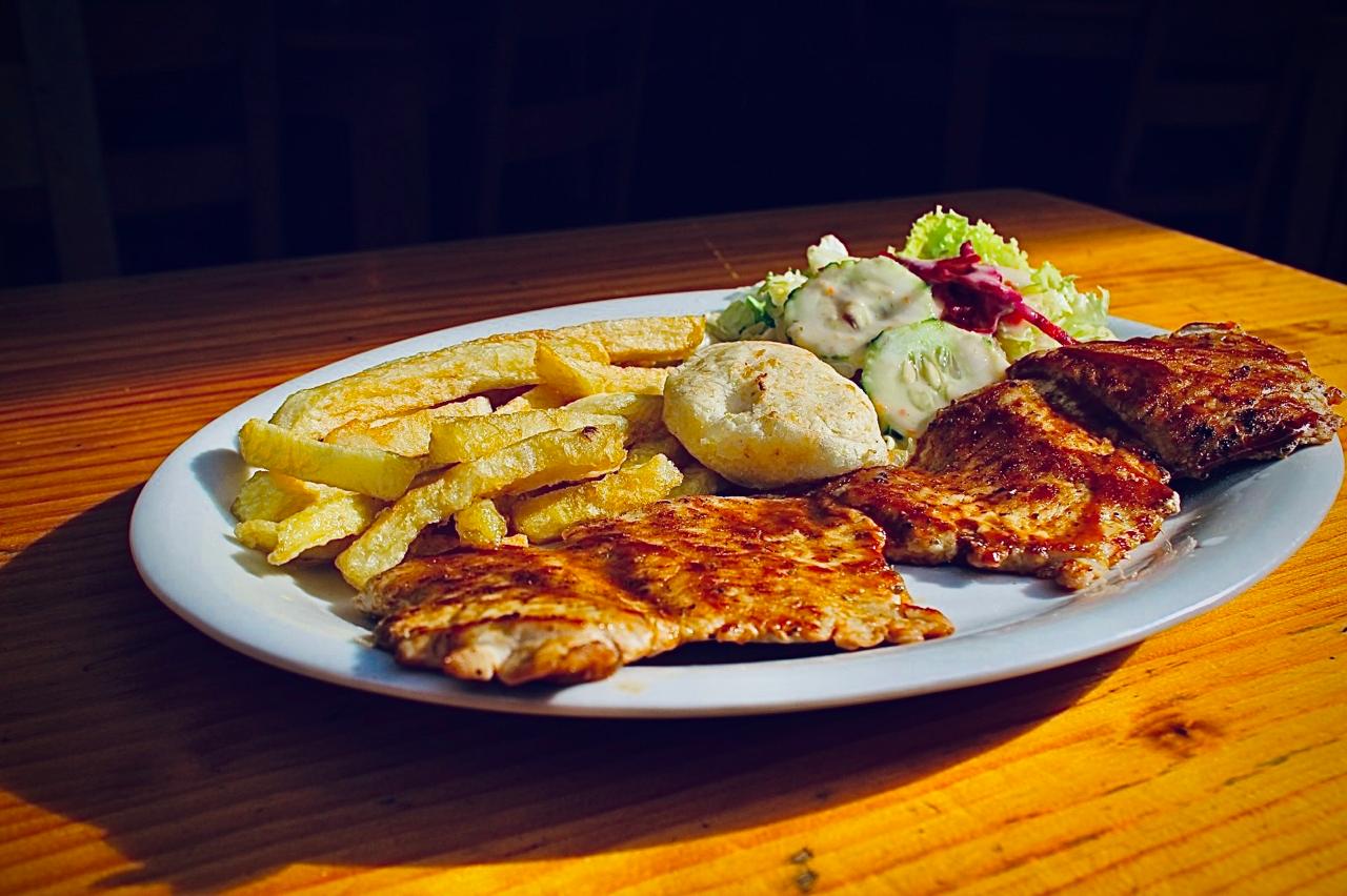 250 g de filete de pechuga acompañado de papas al vapor o francesas, arepa y ensalada.