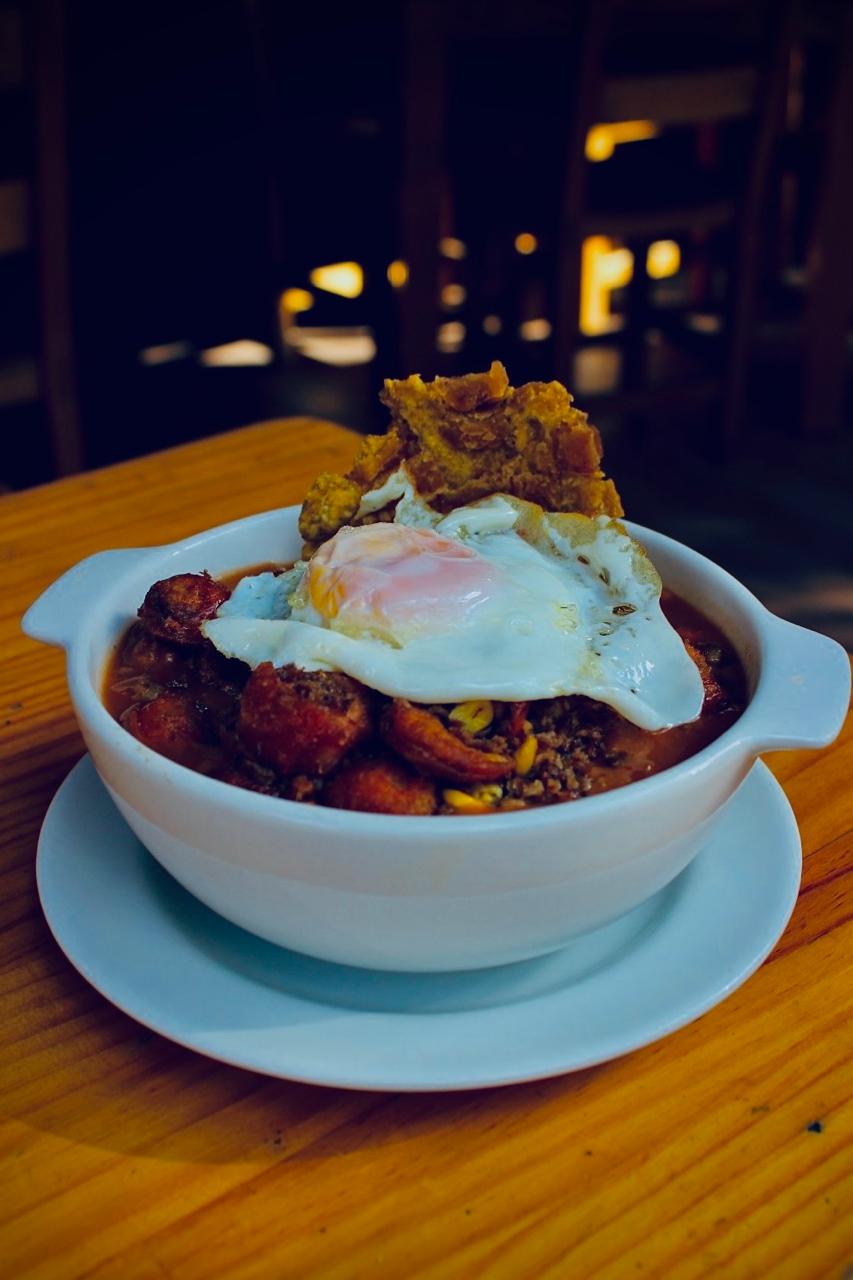 Frijol, chicharrón carne molida, chorizo, morcilla, huevo, arroz, aguacate, tajada de maduro, papas a la francesa, arepa y ensalada.