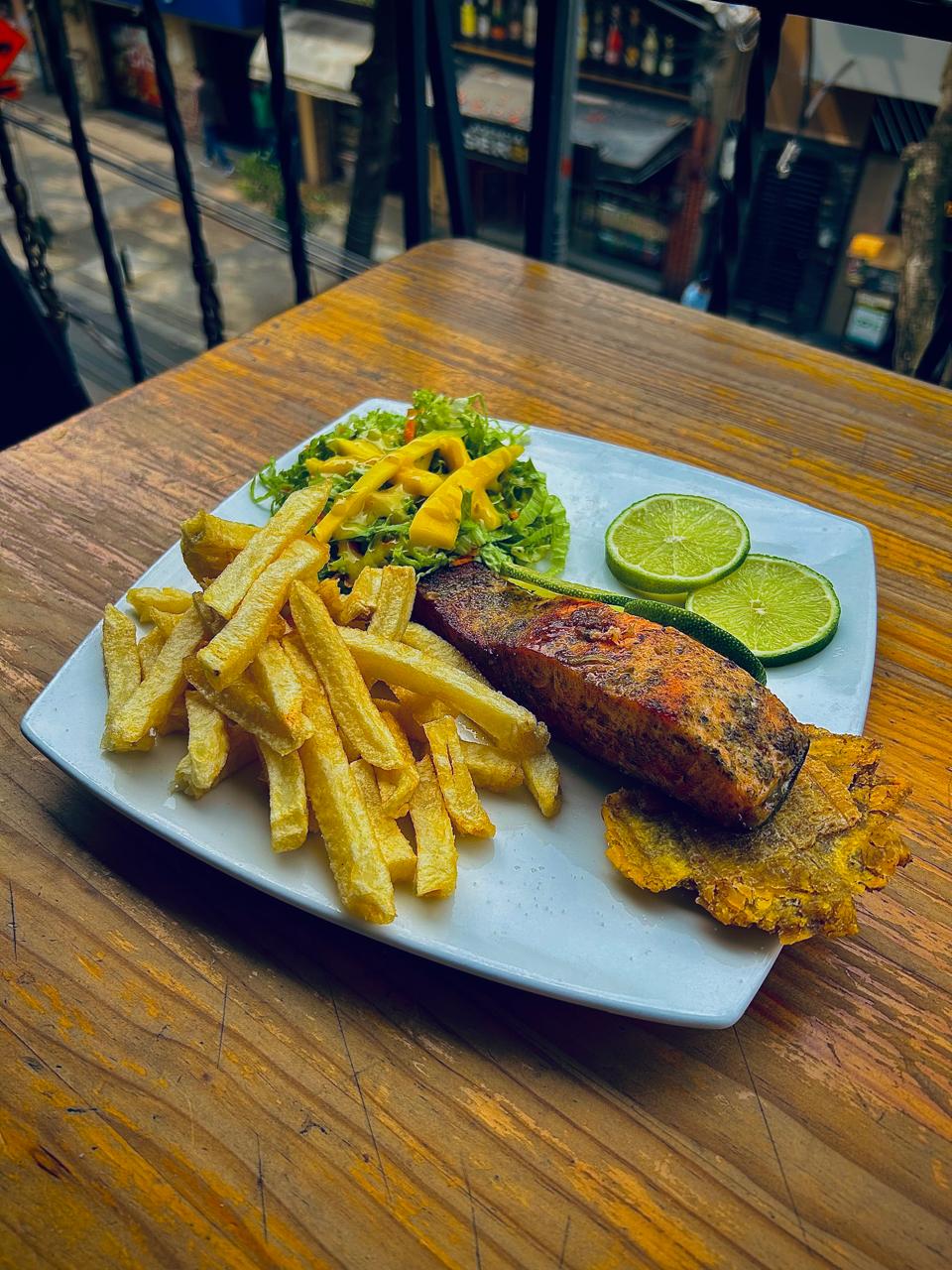 200g de filete de salmón, papas al vapor, patacón y ensalada.