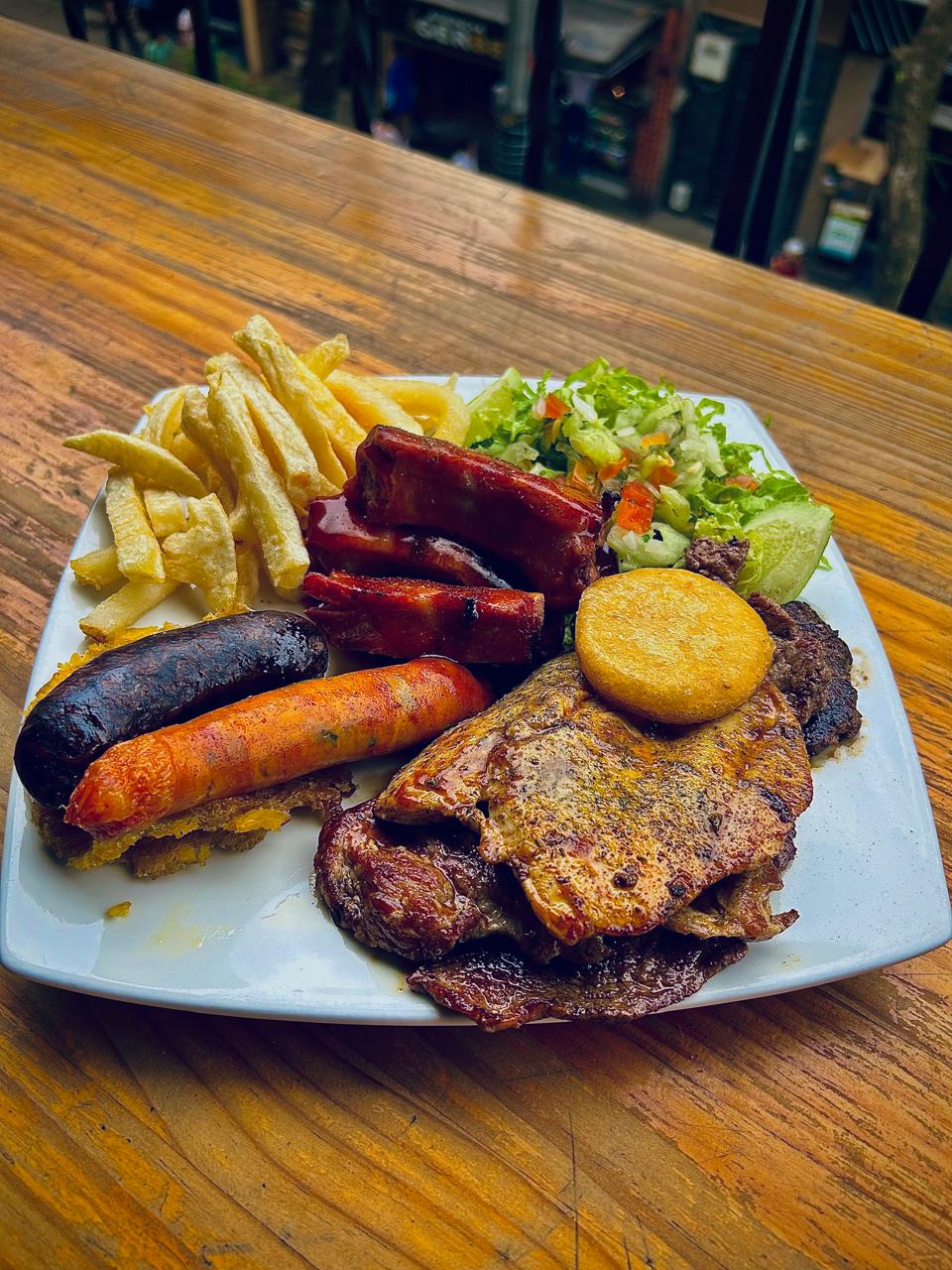 500 g de carne y costilla de cerdo, res, pollo con chorizo, morcilla, papas a la francesa, arepa, patacón y ensalada.