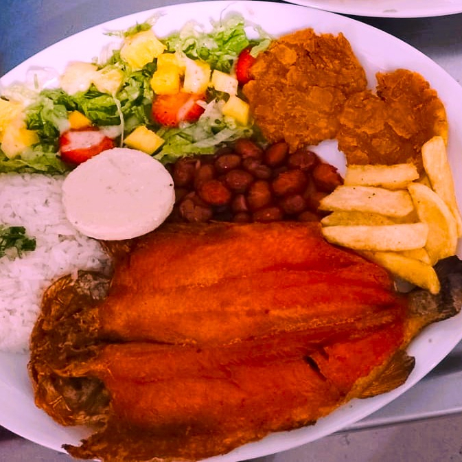 Rodaja de bagre frita (basa), arroz, ensalada de la casa, aguacate, 1 patacón mediano, arepa, limón, sopa y bebida a elegir.