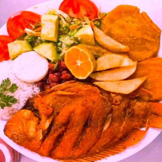 Tilapia frita de 500 g, arroz, ensalada de la casa, aguacate, 1 patacón mediano, arepa, limón, sopa y bebida a elegir.