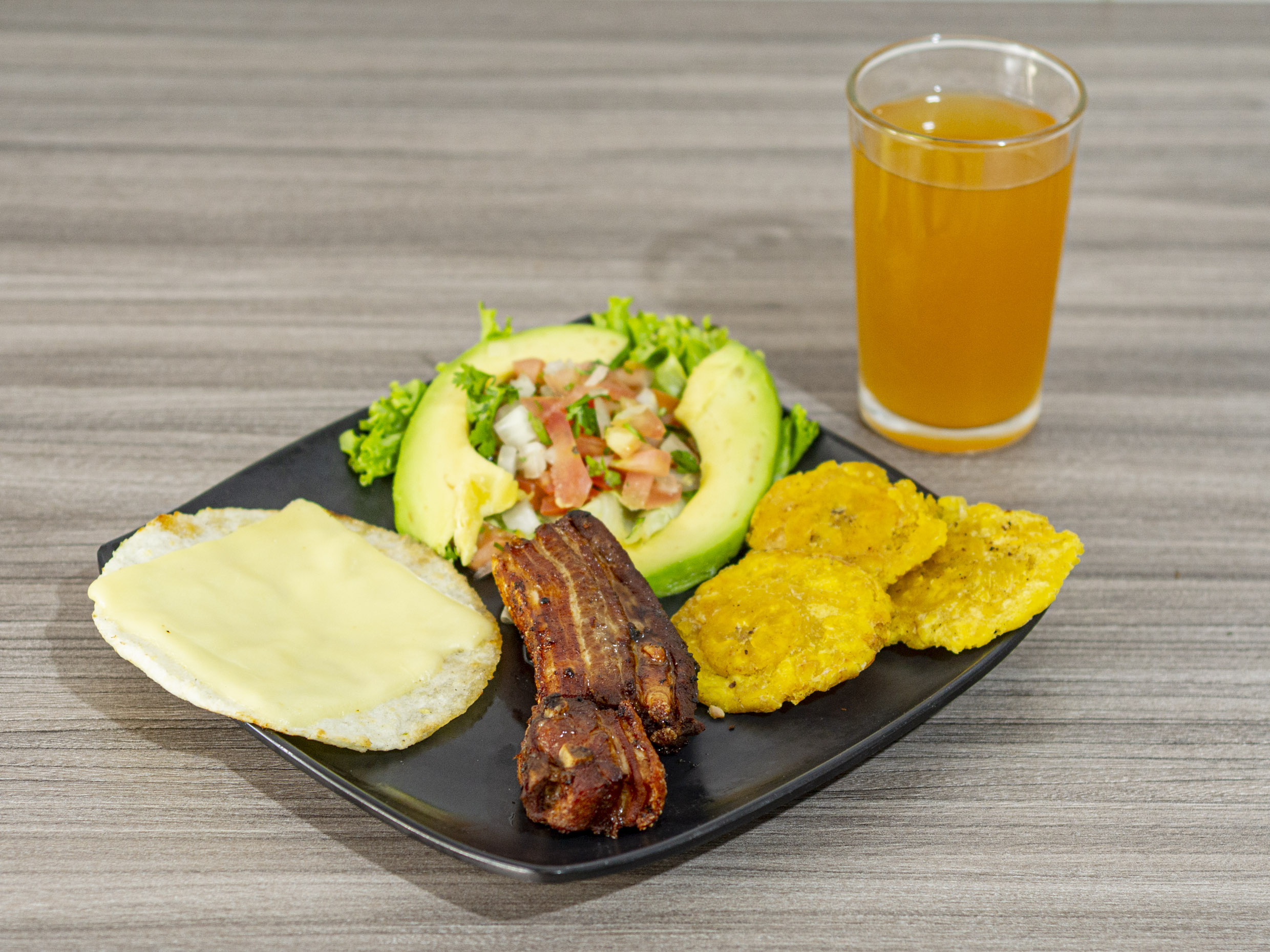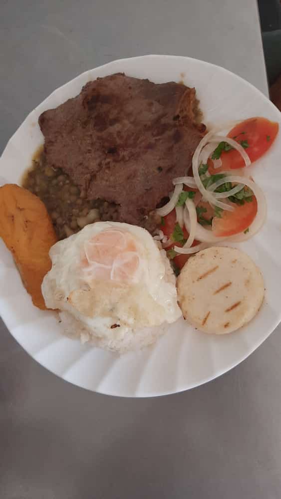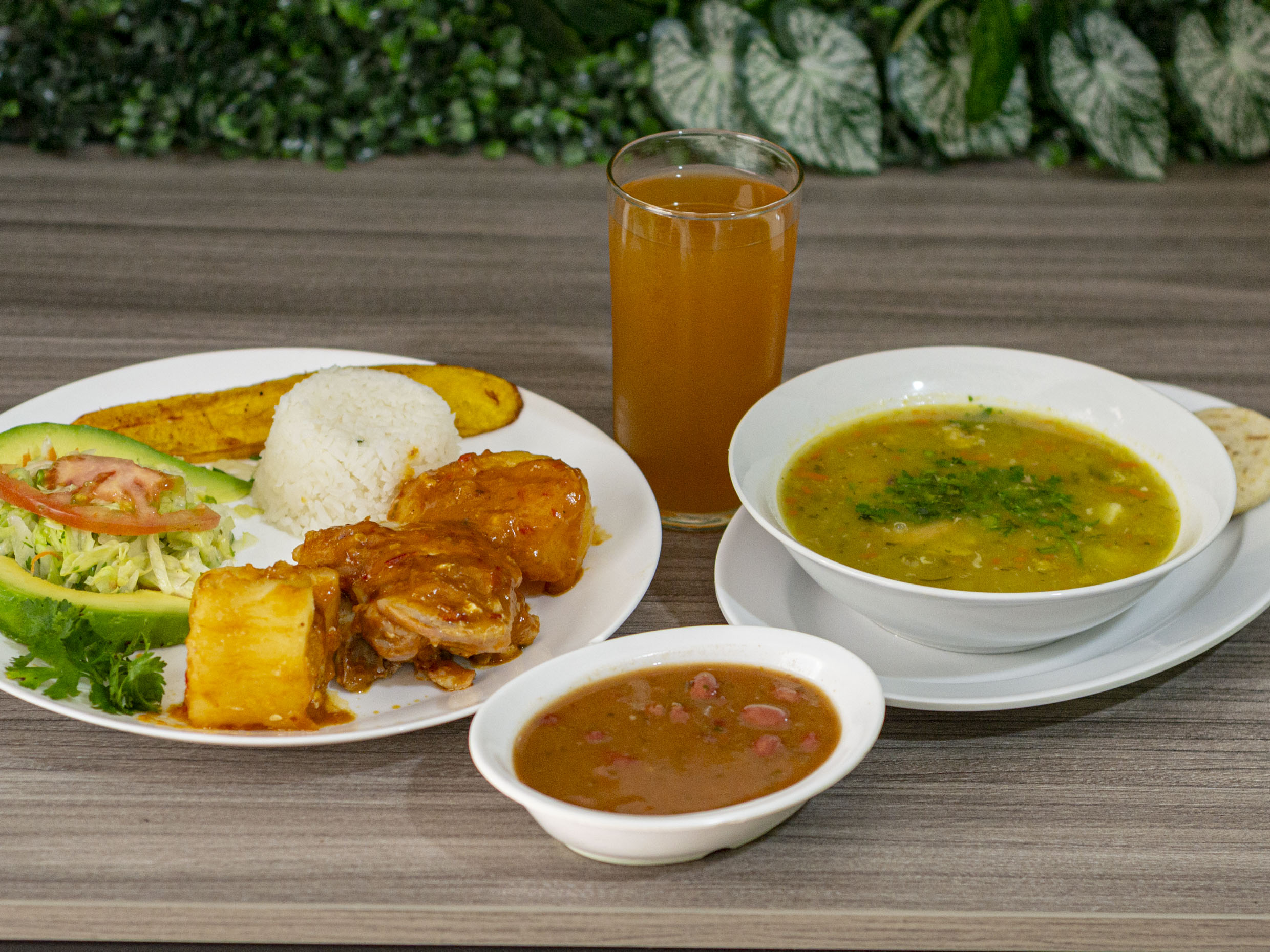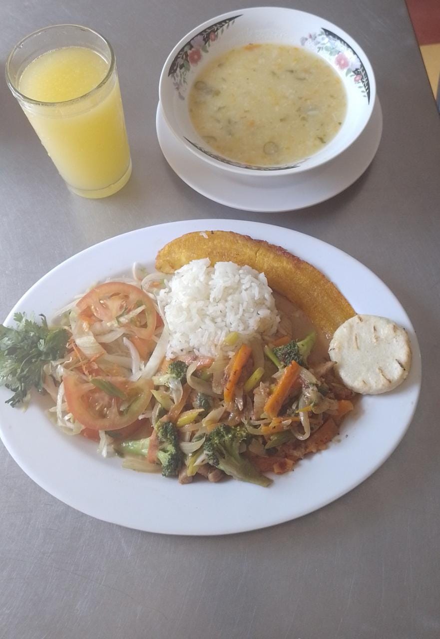 Sopa del día, jugo del día, arroz, cerdo salteado, arepa, tajada, aguacate