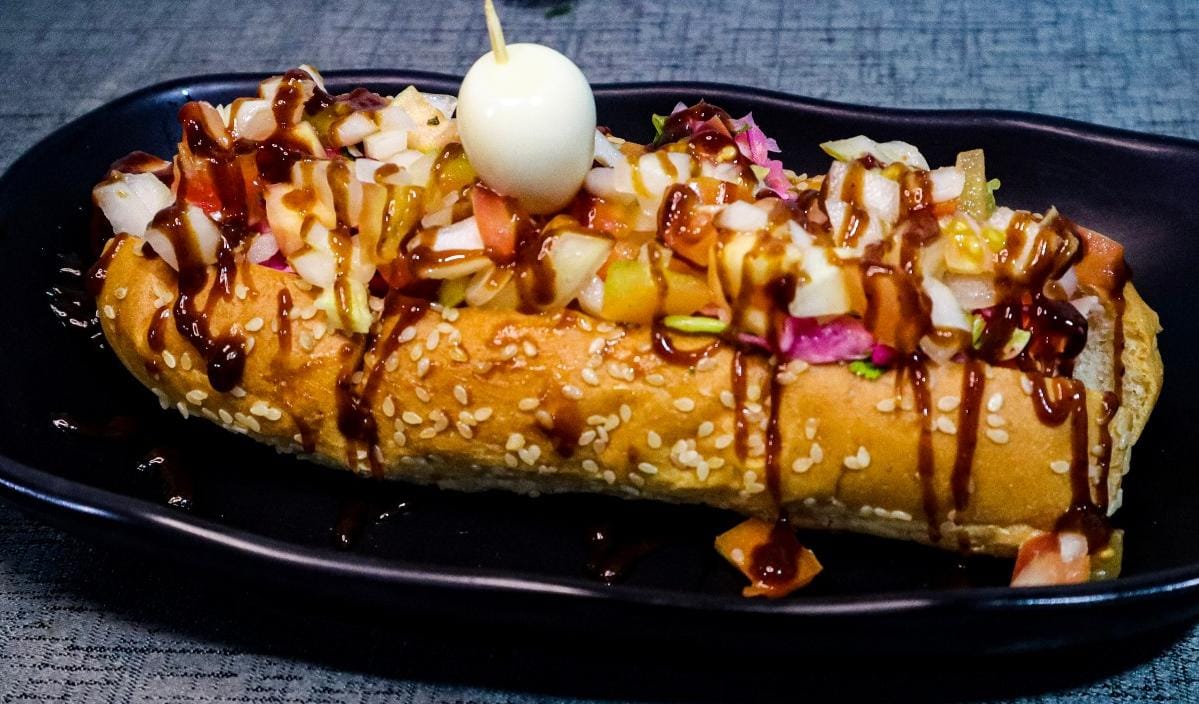 Rico perro especial con tocineta, queso, ripio de papa, ensalada de repollo, huevos de codorniz, salsas al gusto, acompañado de la bebida del dia