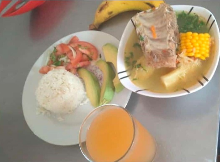 delicioso sancocho de costilla acompañado de arroz,aguacate,banano y ensalada