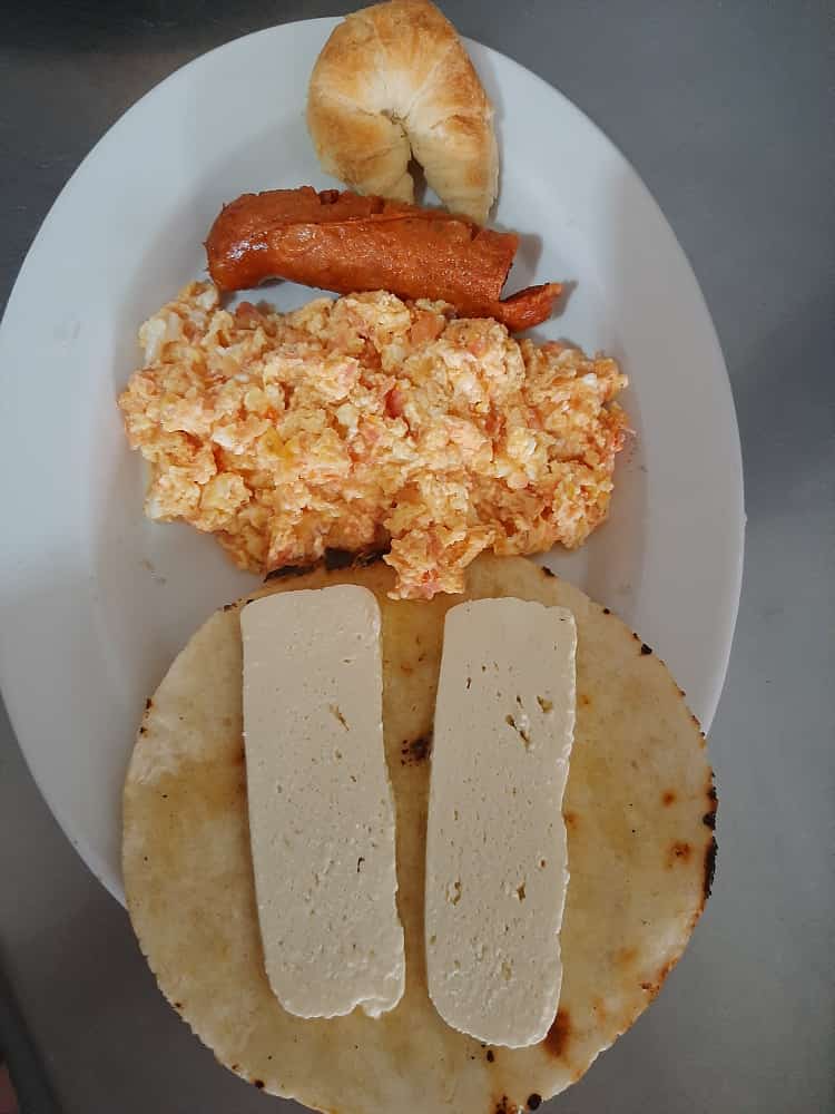 arepa con quesito,huevos pericos,arroz ,pollo a la plancha y pan