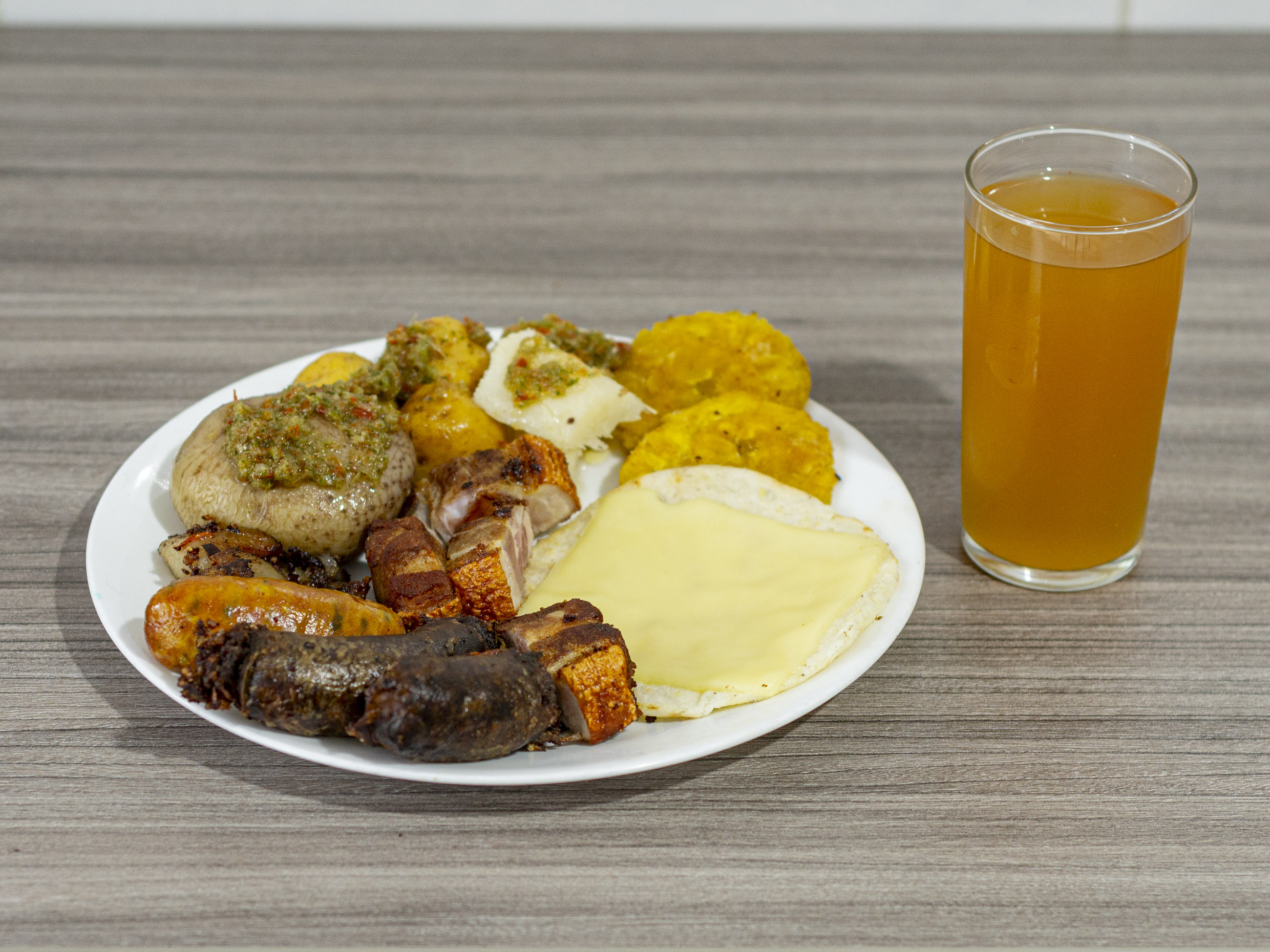 Costichicharron expecial con papas a eleccion, ensalada casera, arepa con queso y mozarella, costichicharrony bebida del dia