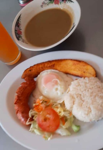 Calentado, huevo, pan, arepa, quesito carne de res, cerdo, chicharrón o pollo. Chocolate, café jugo