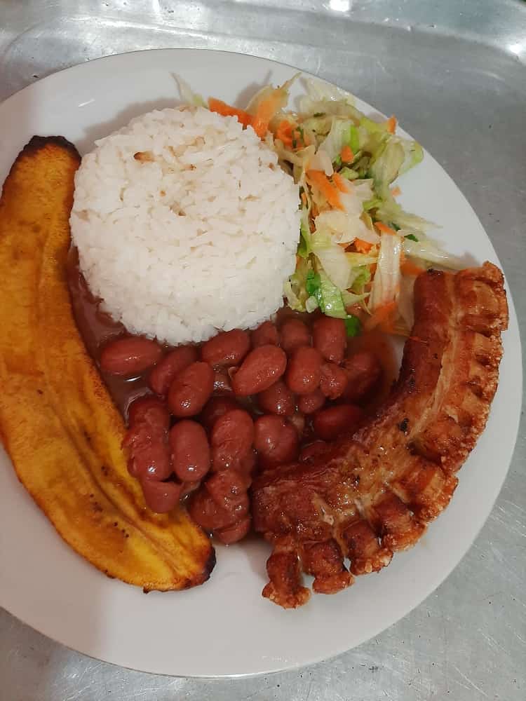 porción de arroz, ensalada, tajada de maduro, frijoles, carne de cerdo