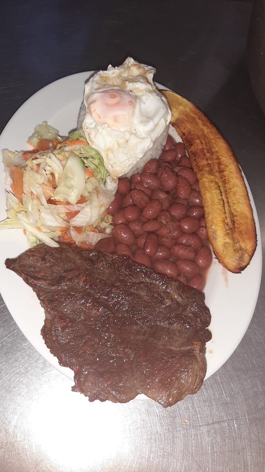 porción de arroz, ensalada, tajada de maduro, frijoles, carne de res