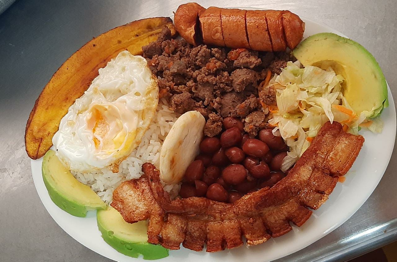 Deliciosa bandeja tradición paisa, acompañada de porción de frijol, arroz, chicharrón, carne molida, aguacate, arepa, tajada de maduro, ensalada, huevo frito, chorizo de ternera, jugo del día.
