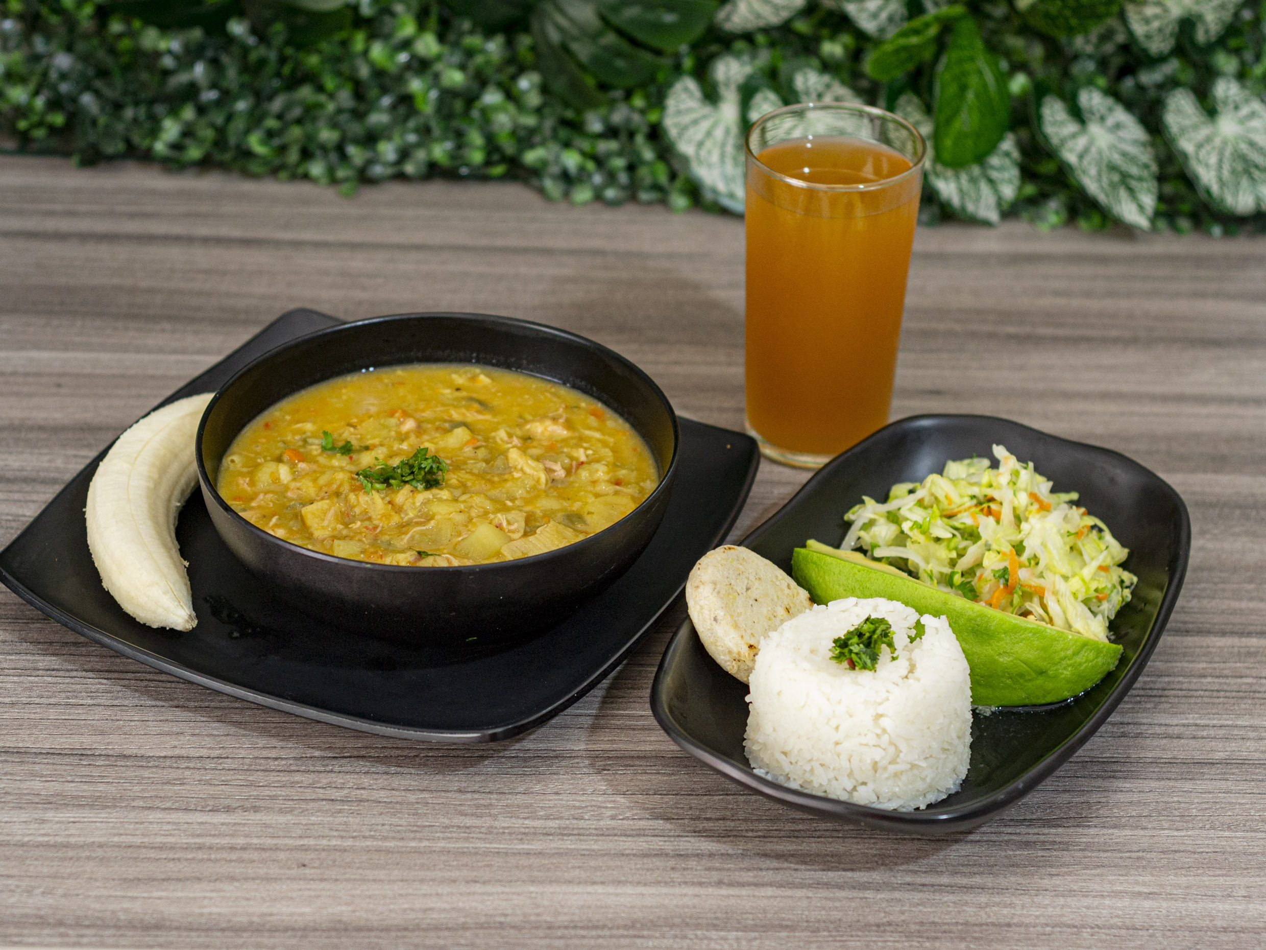 Arroz, ensalada, aguacate, tajada, papas, yuca, sopa del día y sobremesa