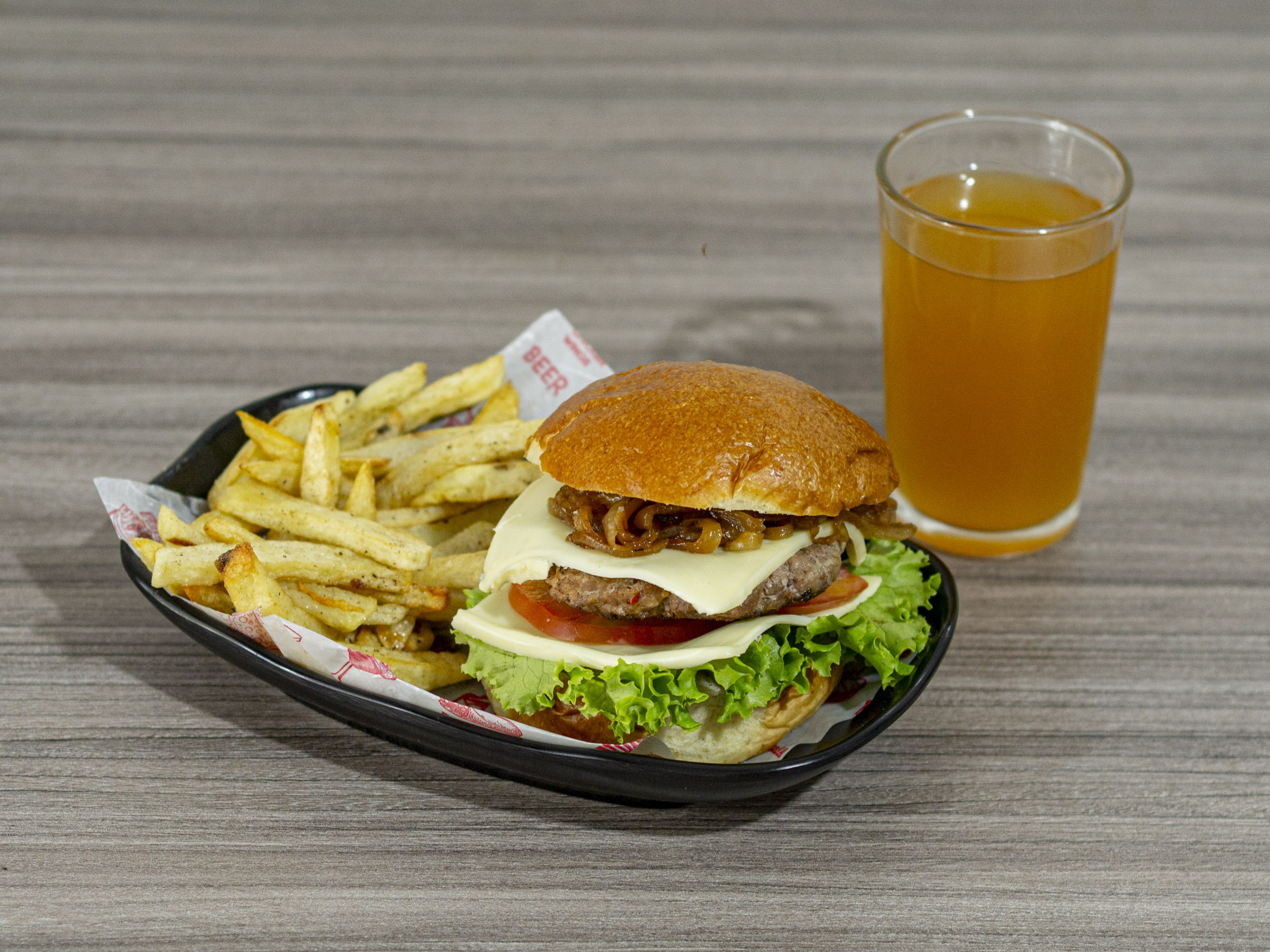 Hamburguesas mixta con carne Artesanal de 150gr, lechuga, pepinillos, tomate, cebolla caramelizada, tocineta, doble porcion de queso mozarella, Con porción papas a la francesa y bebida del dia
