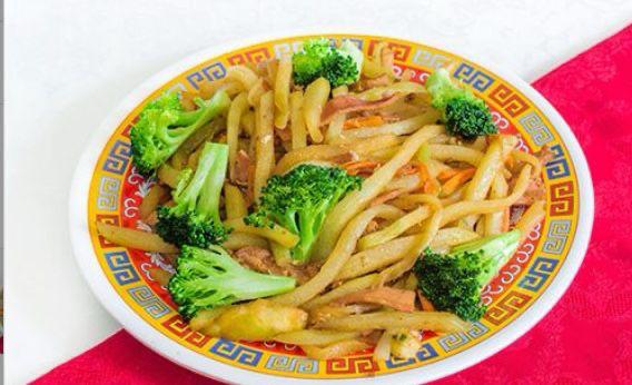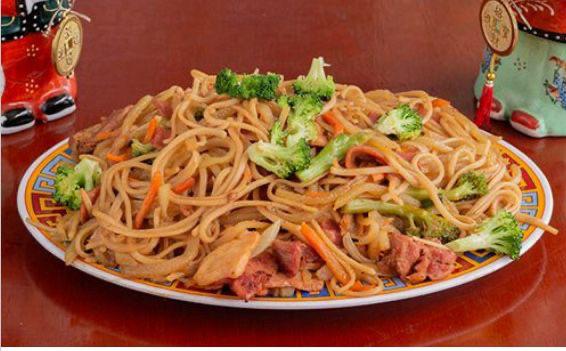 Tallarines chinos con pollo, cerdo, jamón, salsa de soya y vegetales.