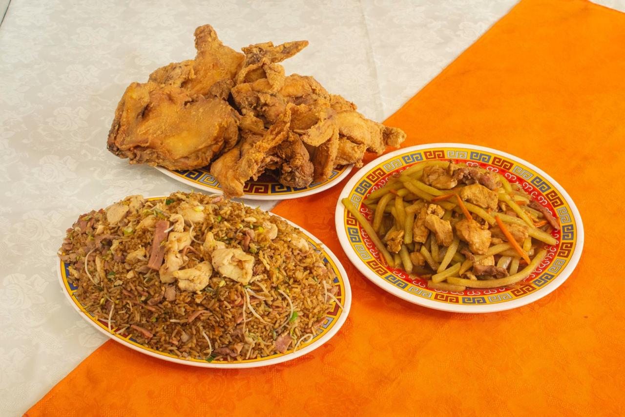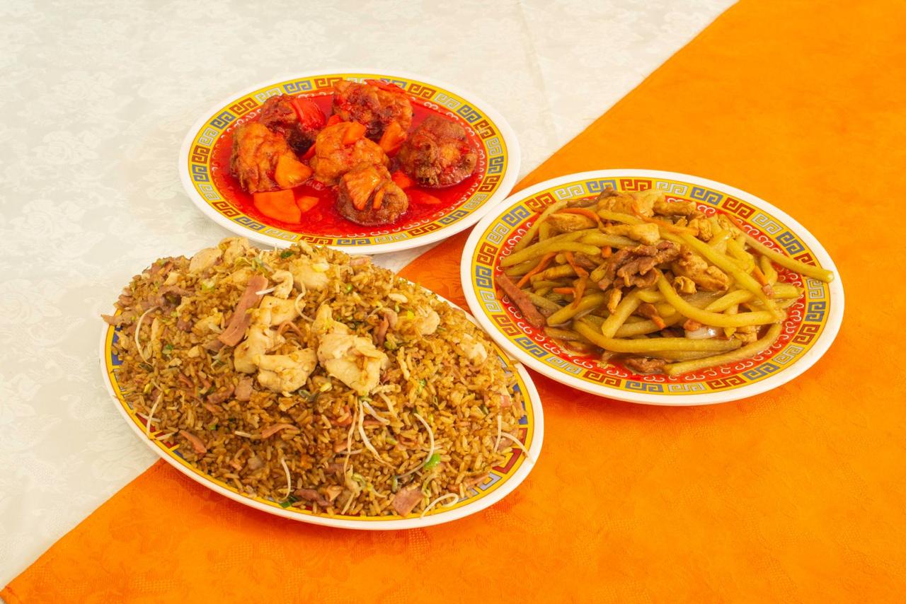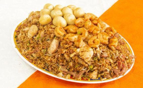 Arroz chino oriental para 2 ó 3 personas máximo, incluye: pollo picado, cerdo picado, jamón picado, camarones, huevos de codorniz, salsa agridulce ( si el cliente lo desea)