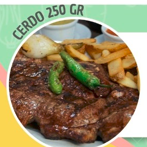 250 gr de carne de cerdo, ensalada de la casa, papas a la francesa, arepa y jugo del dia.