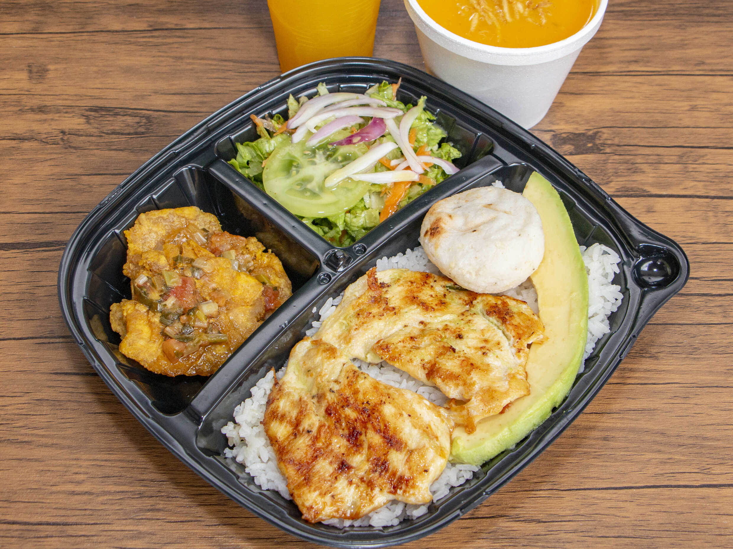Sopa 12 onz, Arroz, ensalada, huevo o aguacate, arepa, acompañante,Carnes a la plancha 110 grs (Cerdo, res, pollo), molida, chicharrón, filete de pollo en salsa de ciruelas. Jugo del dia