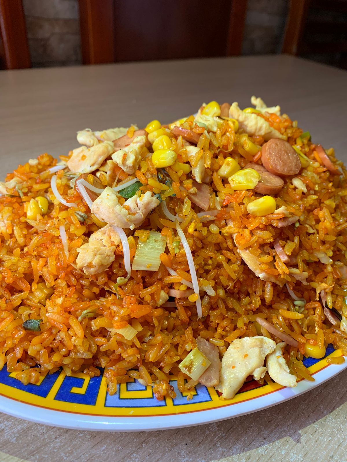 Arroz amarillo, trae pollo, cerdo, jamón, maicitos, salchicha ranchera, raíces chinas y cebolla ¡Perfecta combinación entre Colombia y China!