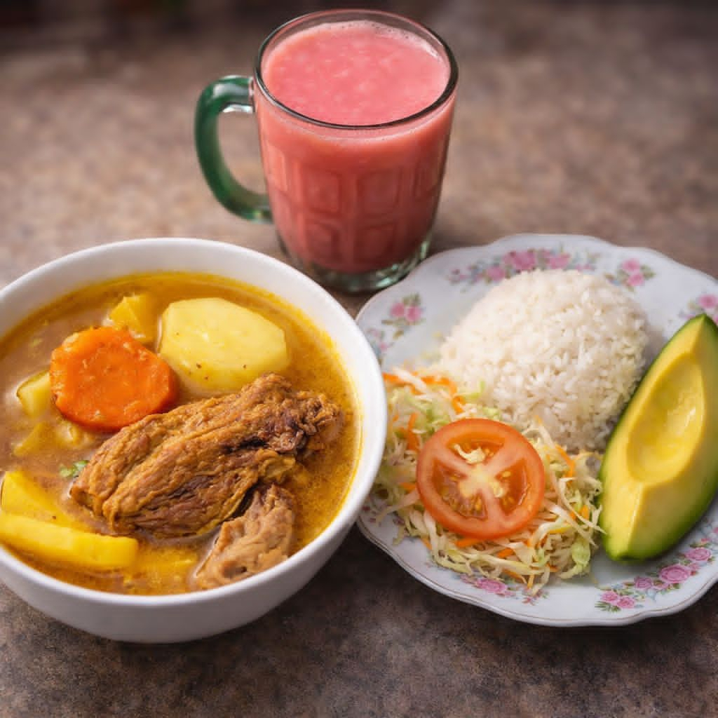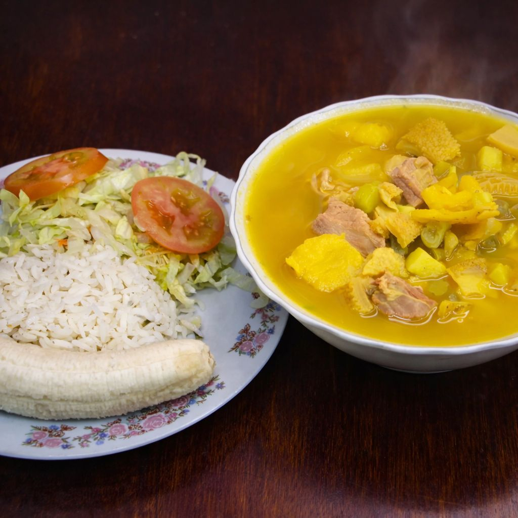 Platillo personal: pollo sudado, arroz, papa sudada, tajada madura, ensalada, sopa a elección y jugo (sabor disponible en tienda).