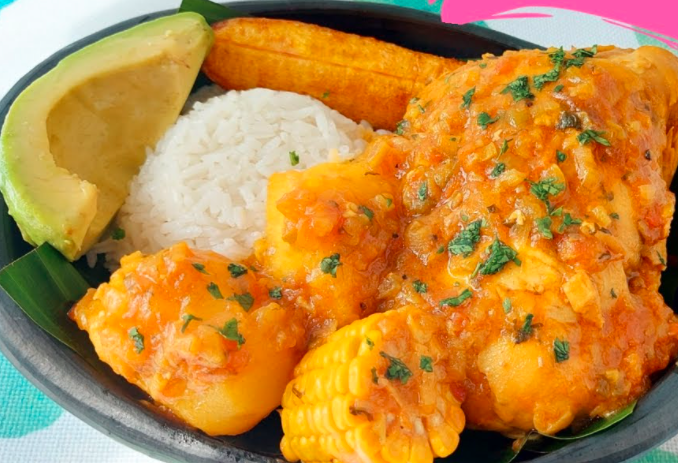 Pernil de pollo, mazorca, papa, yuca, arroz, ensalada, aguacate o banano. En contenedor de 24 onzas.