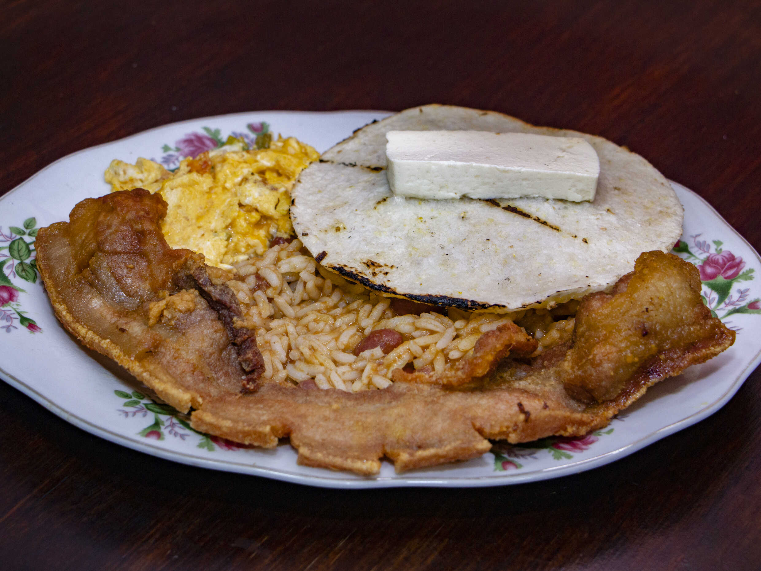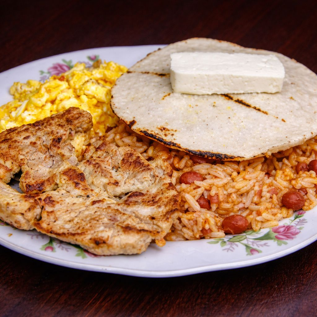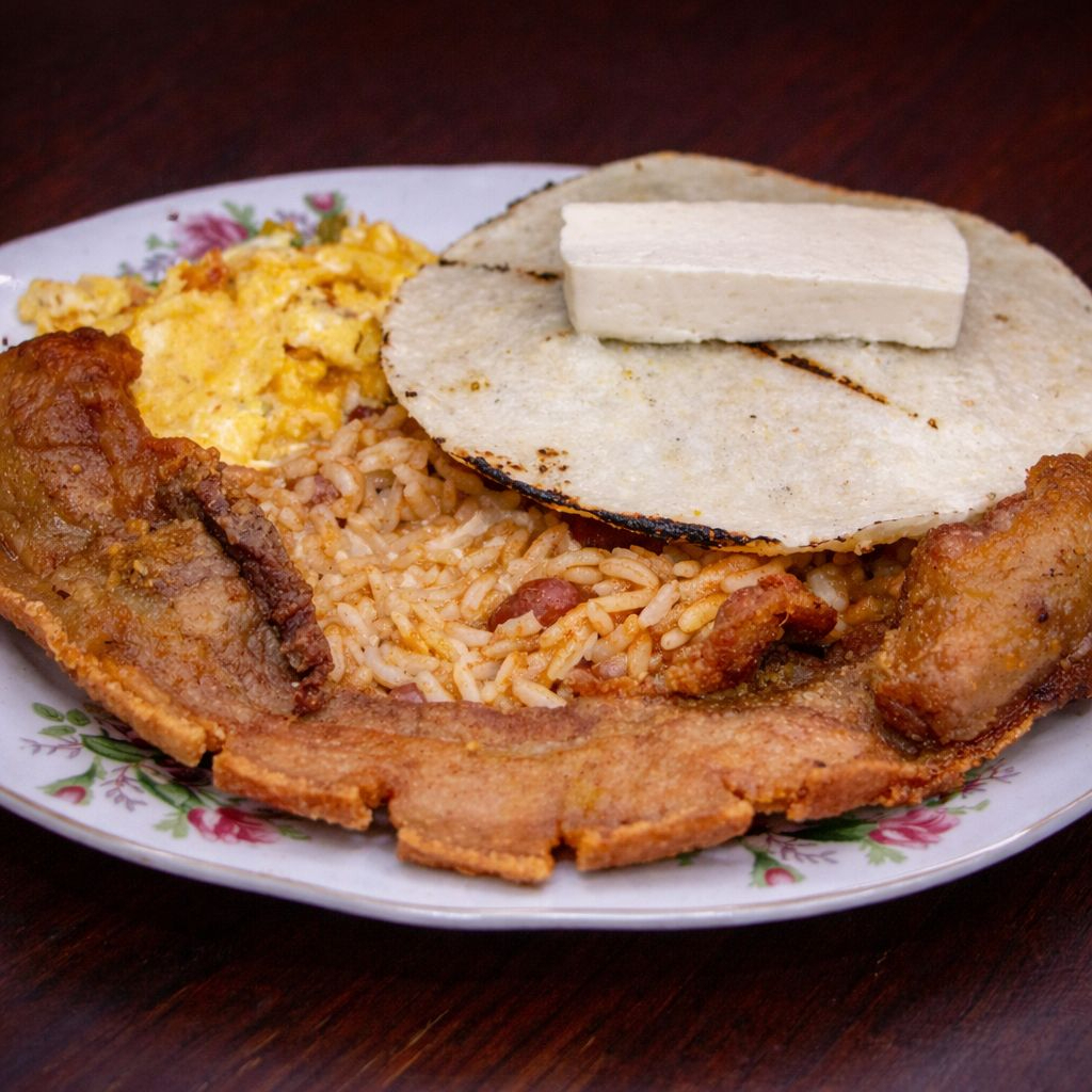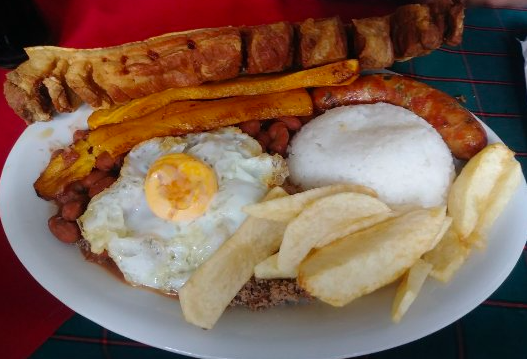 Platillo personal, máximo para dos personas con un gramaje aproximadamente 500 gr. Incluye chicharrón, una porción de arroz, frijol, una porción de papa frita, un huevo, tajadas de plátano, ensalada a escoger, sopa al gusto de 12 onzas entre pescado, sancocho o pollo y jugo claro o guarapo de 12 onzas.