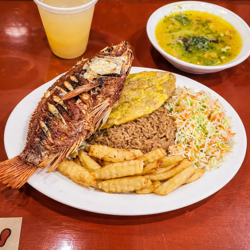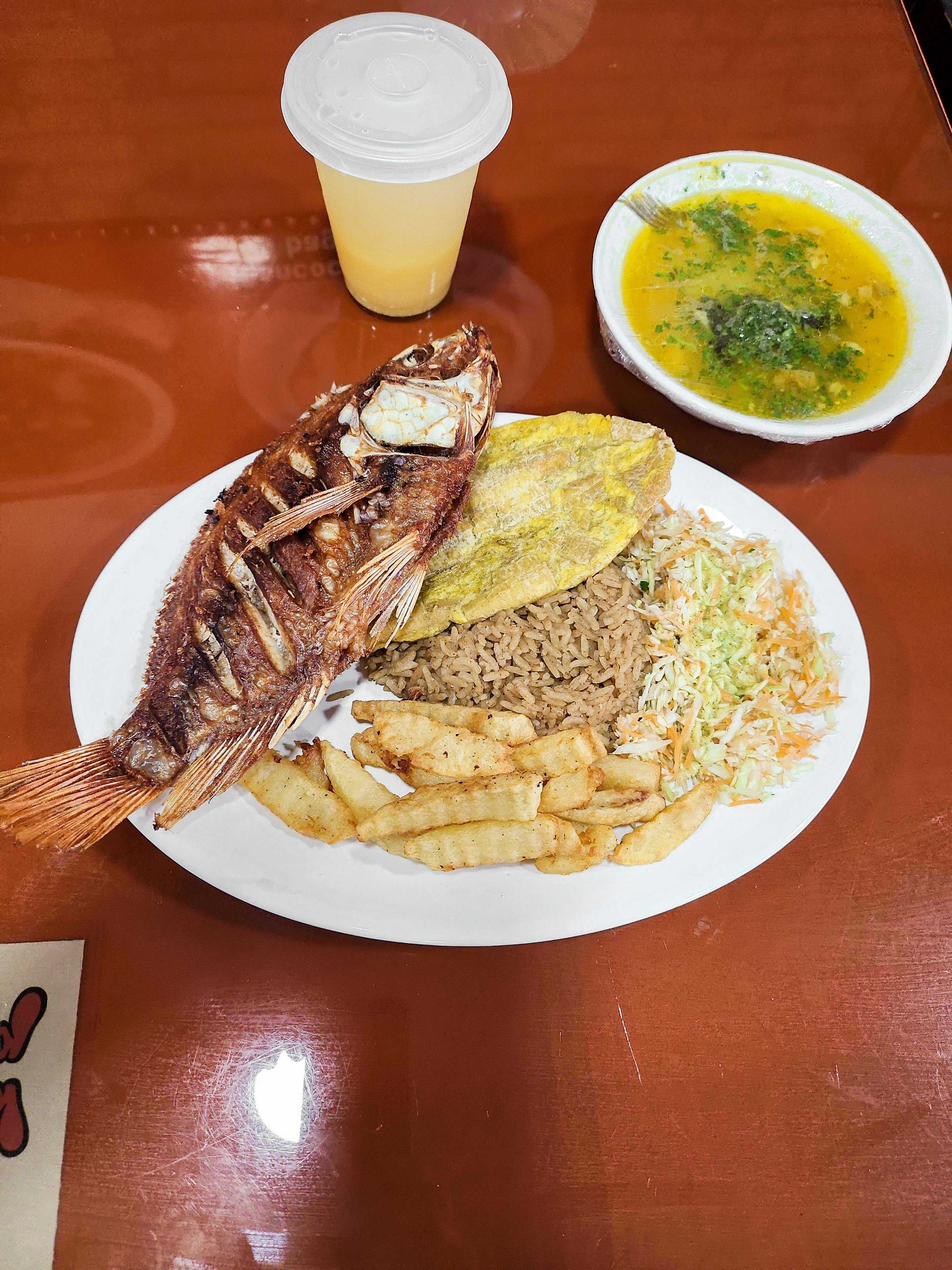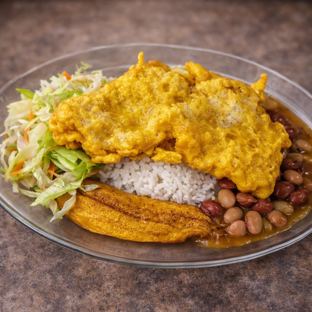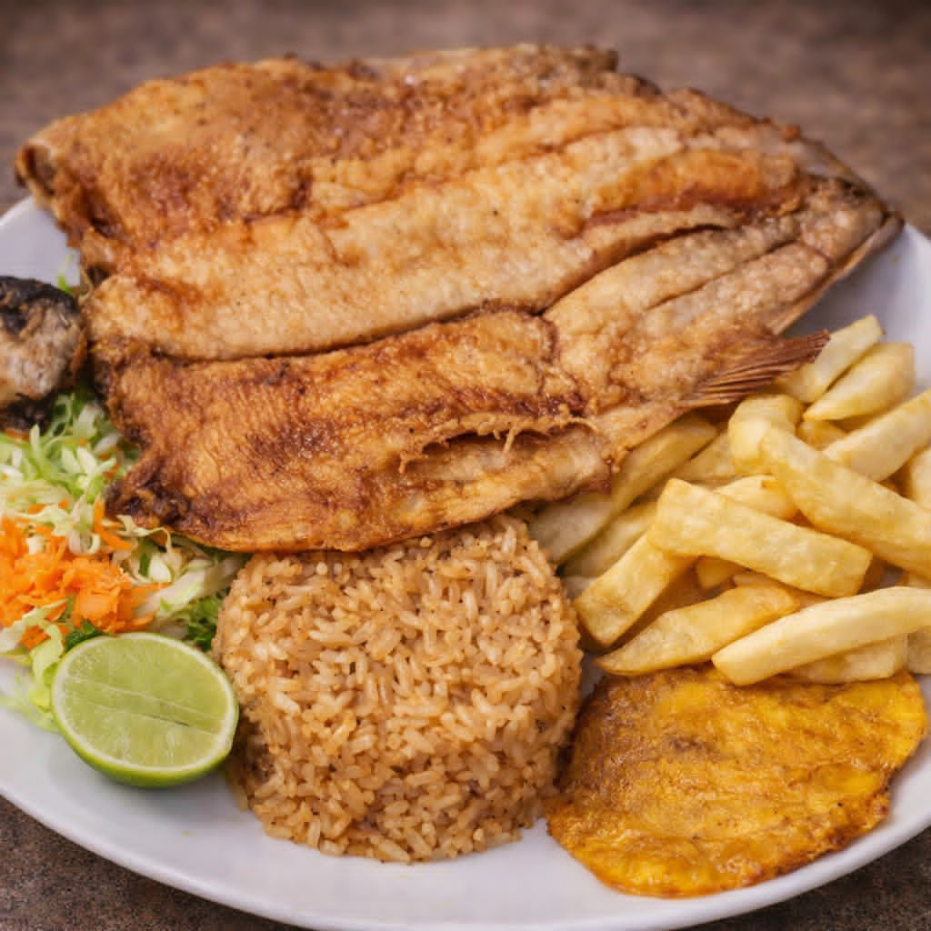 Arroz, frijoles, ensalada, tajada madura, papas, róbalo apanado y sopa que este disponible.