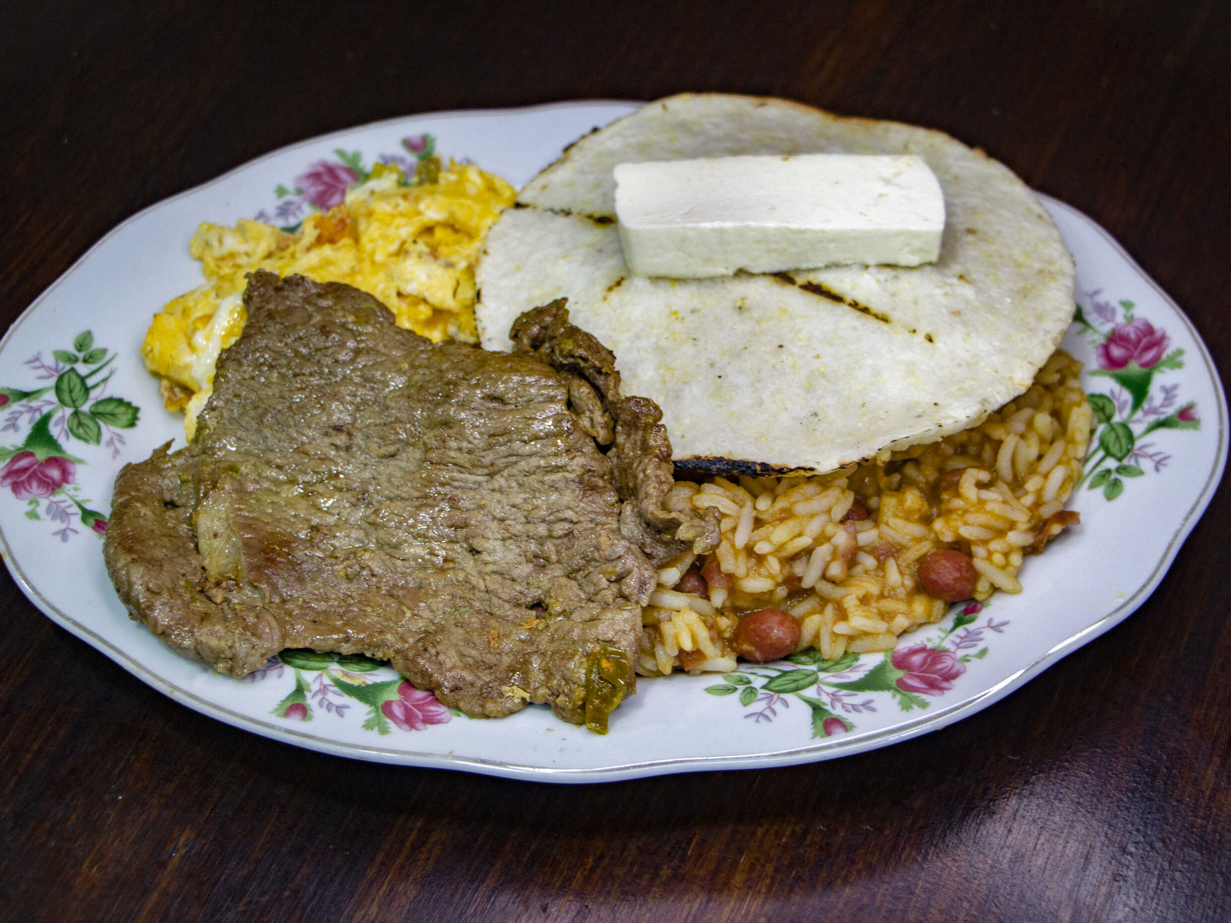 Res, huevos revueltos, calentado, arepa, queso y chocolate.