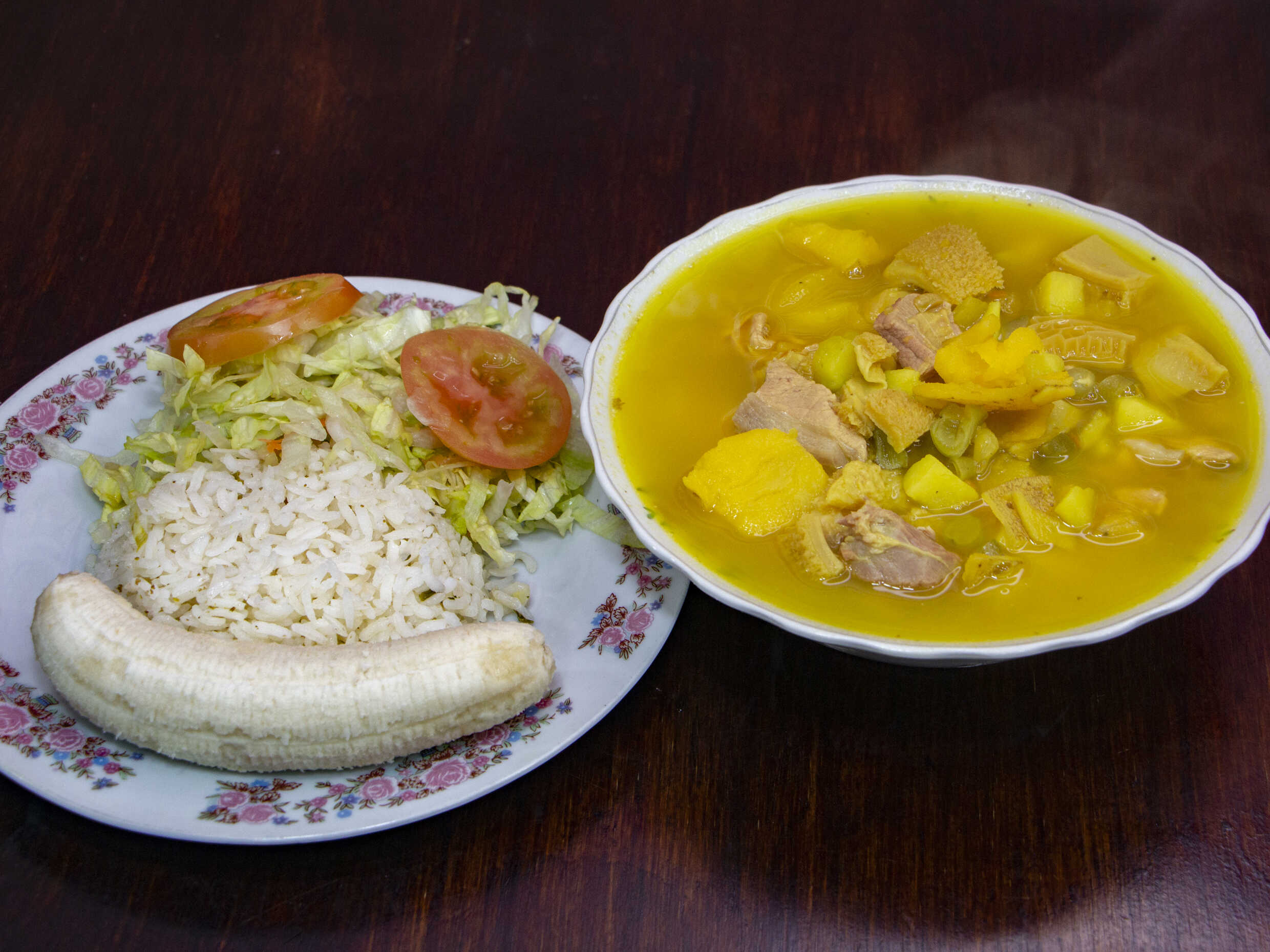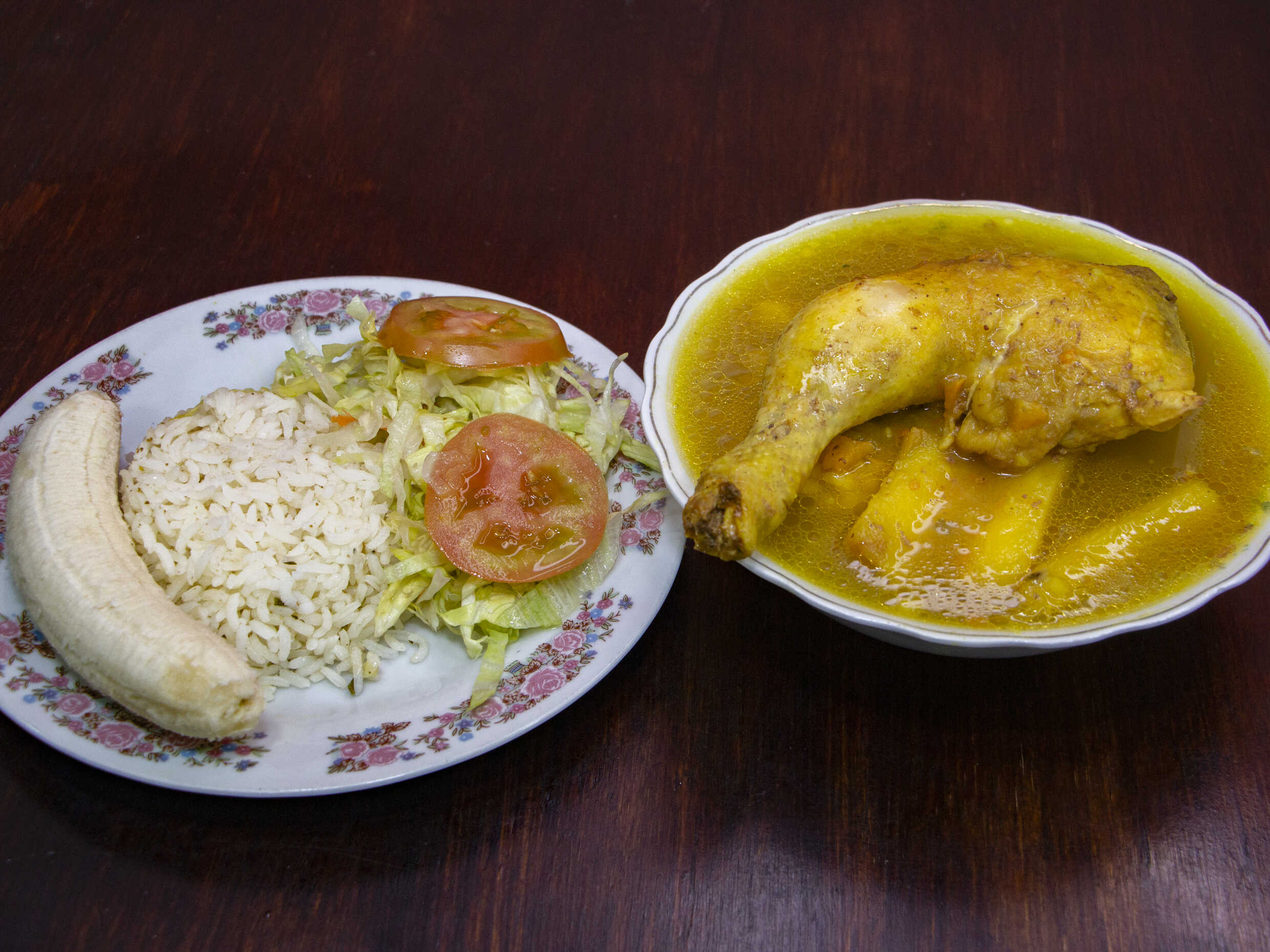 Pollo sudado, arroz, papa sudada, tajada madura, ensalada, sopa y jugo.