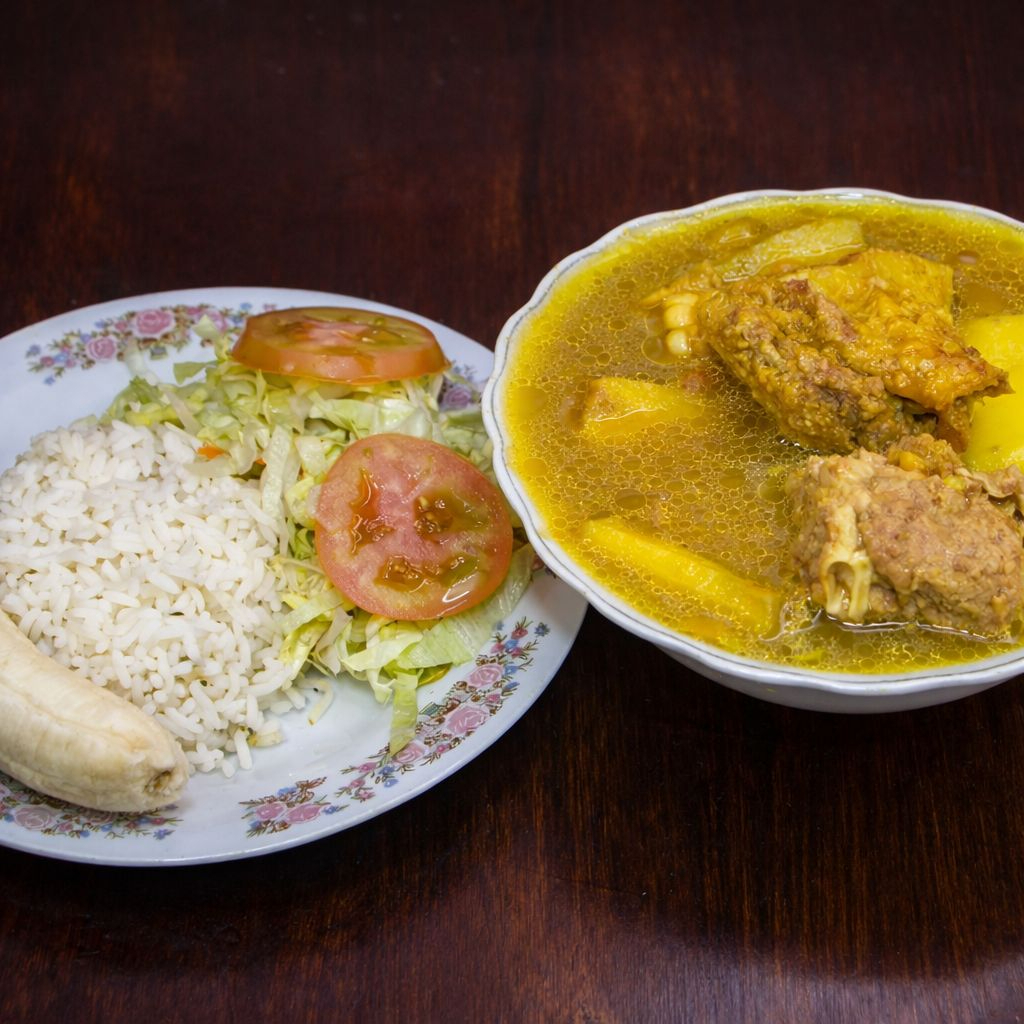 Sancocho de pescado especial, 300 gramos de bagre, arroz a elegir, ensalada de tomate, lechuga y zanahoria.