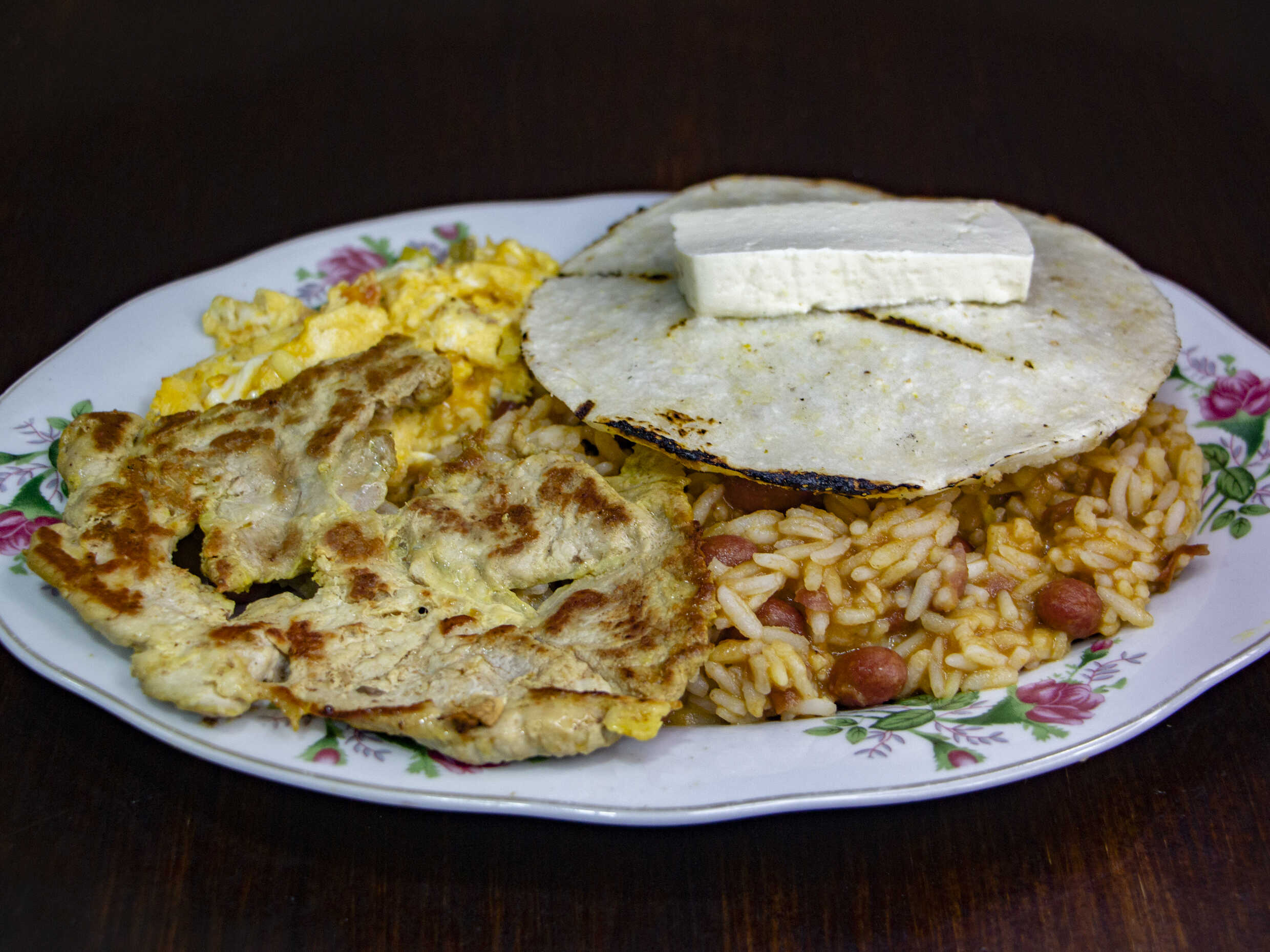 120 g De filete de pollo, arroz, ensalada, papas, tajada madura, frijol y sopa que este disponible.