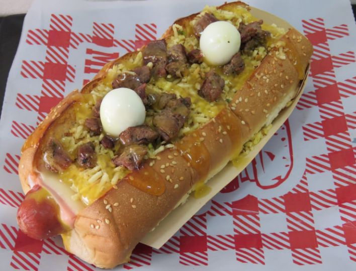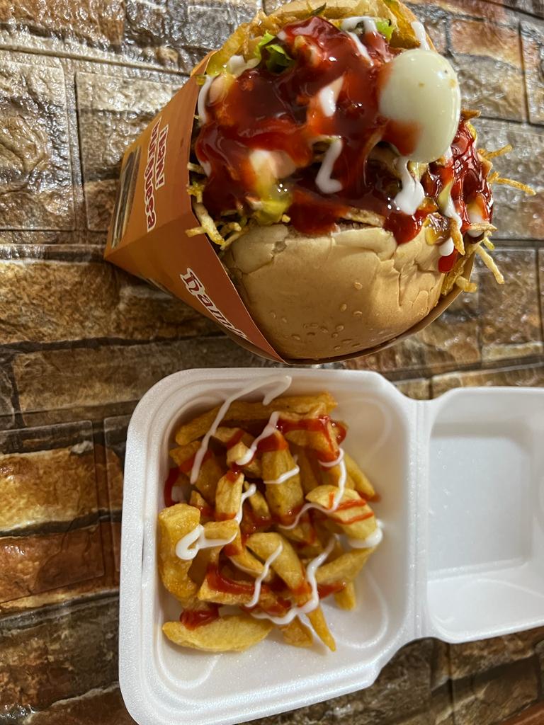 Pan, Salchicha, ensalada, queso, ripio de papas , salsas + porción de papas a la francesa