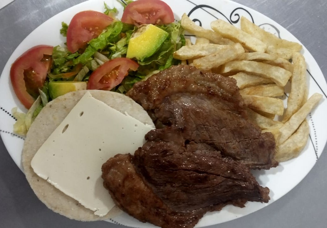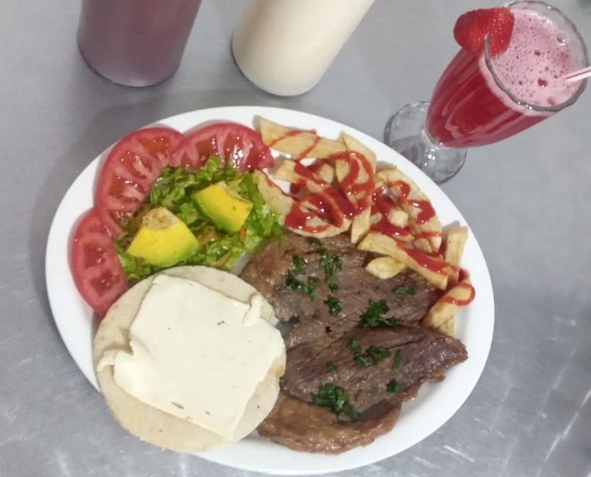 150gr de carne punta de anca, papas a la francesa, ensalada, arepa con queso mozarela, pataconcito y jugo