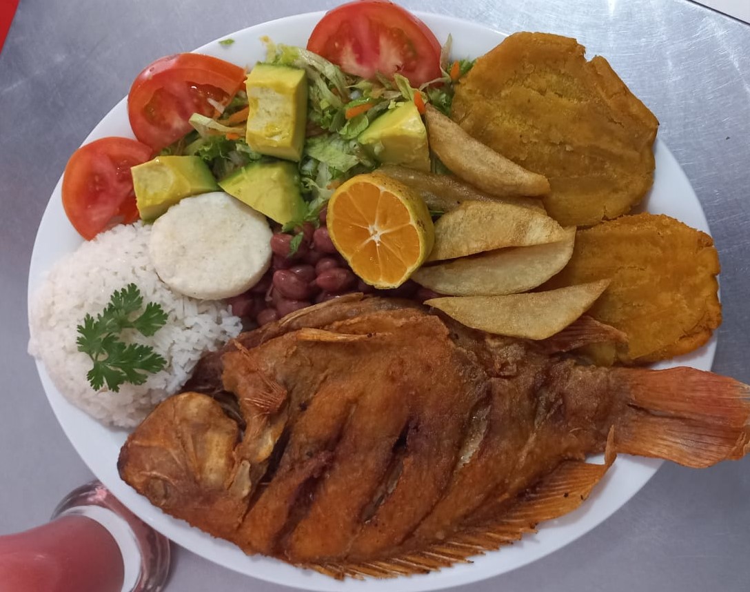 Tilapia Frita , arroz, frijoles, ensalada, patacon, arepita, sopa y jugo del día