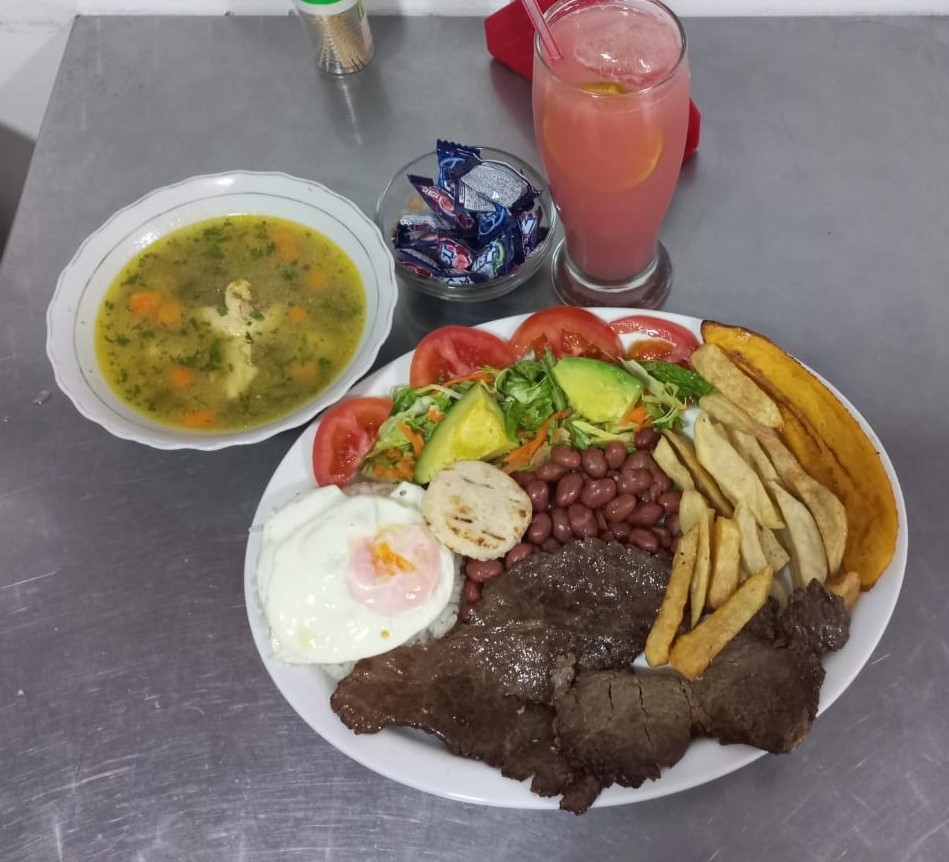 Carne a elegir, arroz, frijoles, ensalada del día, huevo tibio, maduro, arepa, sopa a elegir, y jugo a elegir