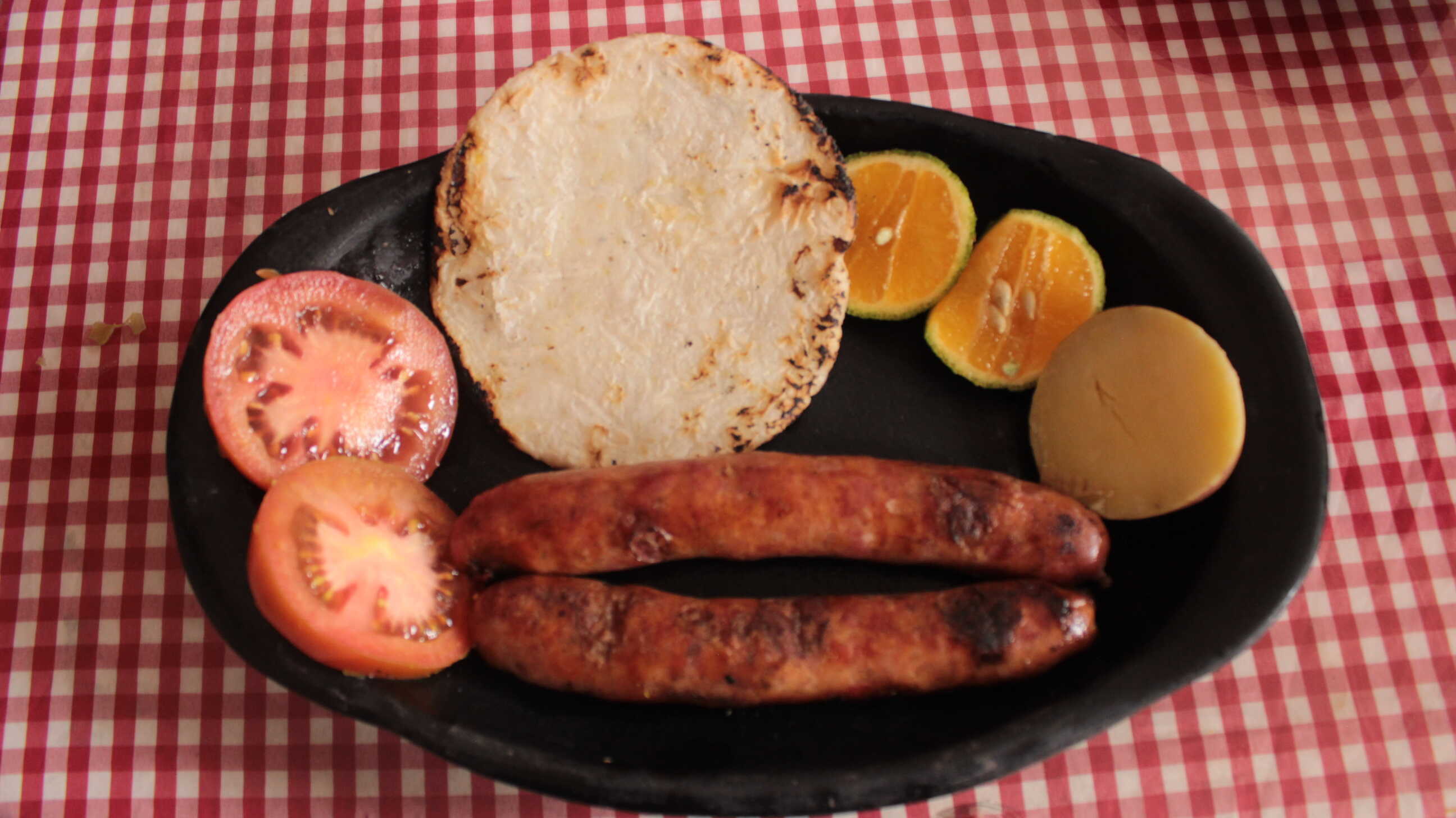 Chorizo grande, papas a la francesa, arepa con queso mozarella, ensalada, pataconcito y salsas