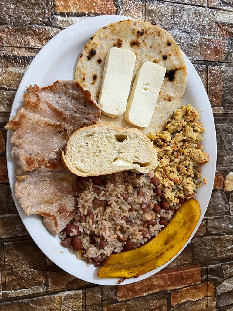 Calentado frijoles con arroz, proteina a elegir, arepa con queso, huevo revuelto con aliños o sin aliños, y bebida a elegir
