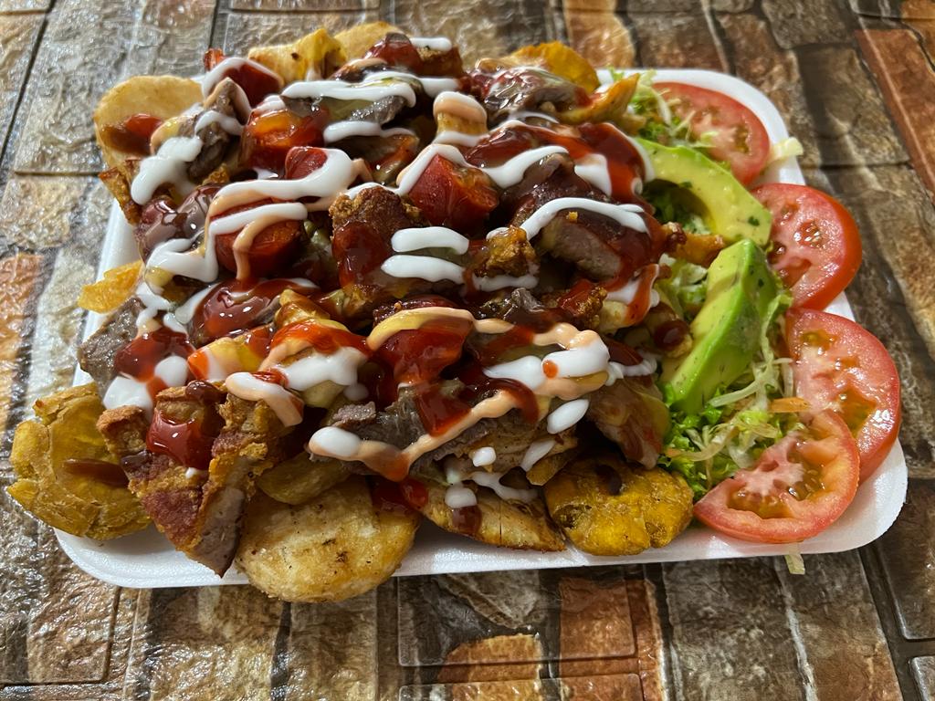 Papas a la francesa, ensalada, pataconcitos, chicharrón, chorizo, carne de cerdo, pechuga, salsas.
