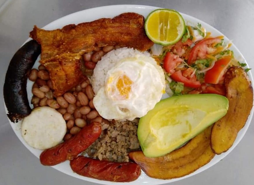Frijoles, arroz, trocitos de (chicharrón, chorizo, salchichas, maduro), carne molida, ensalada de la casa, aguacate, arepa, papas en fosforitos y bebida