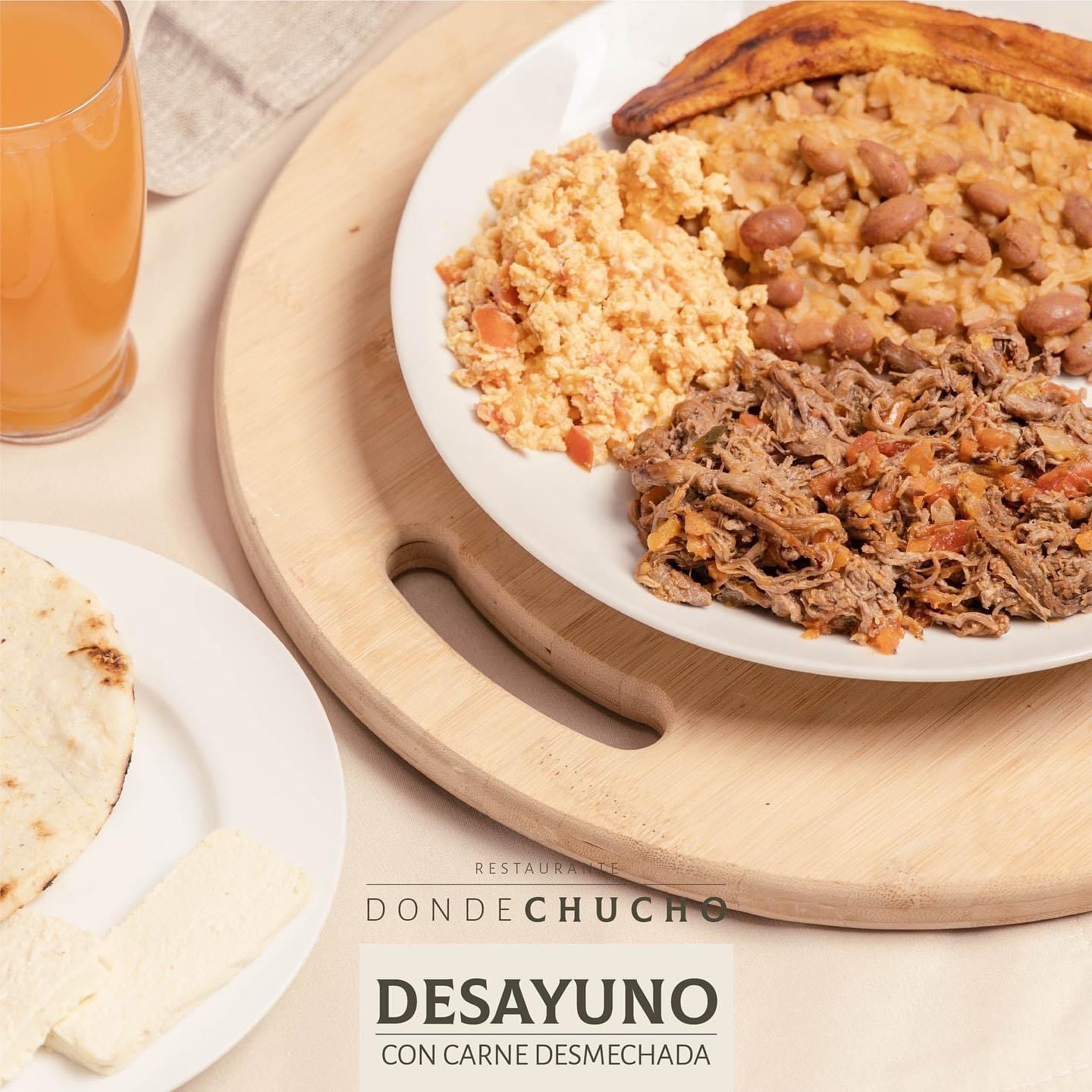 Carne desmechada de manera artesanal y preparada en nuestra salsa de la casa, con calentado de frijoles con arroz, preparado al momento, con huevos revueltos, con o sin aliños o en cacerola acompañado de arepa con mantequilla y quesito. Tambien se puede pedir en arroz blanco. Incluye bebida caliente