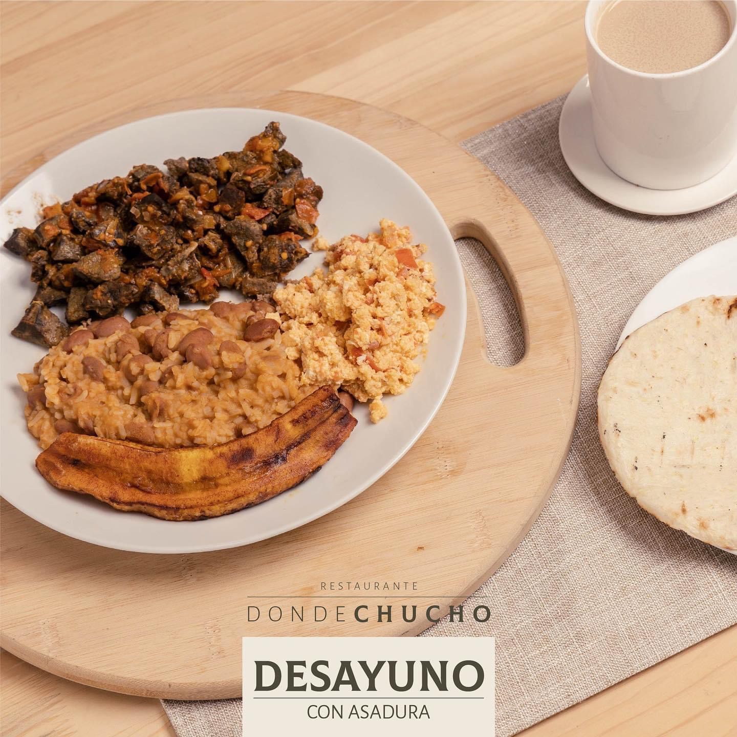 Asadura de res con calentado de frijoles con arroz, preparado al momento, con huevos revueltos, con o sin aliños o en cacerola acompañado de arepa con mantequilla y quesito. Tambien se puede pedir en arroz blanco. Incluye bebida caliente