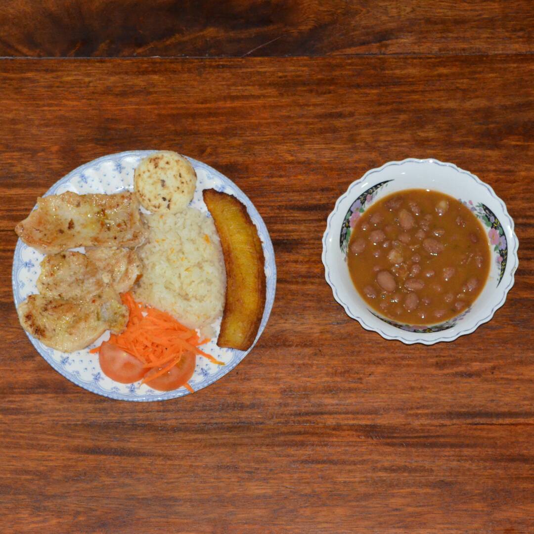 Carne de cerdo a la plancha, acompañada con arroz, ensalada, huevo, papas fritas, plátano maduro y arepa. Puedes pedirlo con frijoles o sopa de tu preferencia.