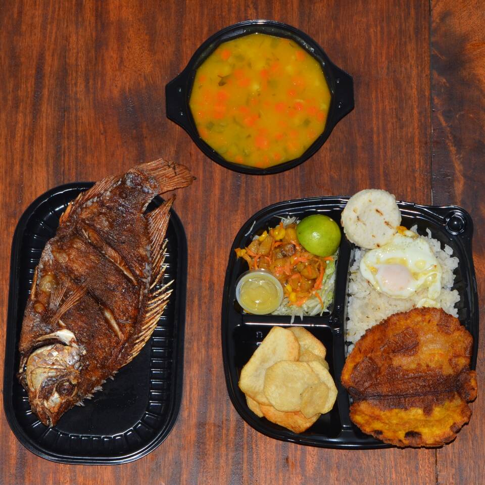 Tilapia frita de 400 gramos, acompañada con arroz, ensalada, huevo, papas fritas, plátano maduro, arepa. Puedes pedirlo con frijoles o con la sopa de tu preferencia.
