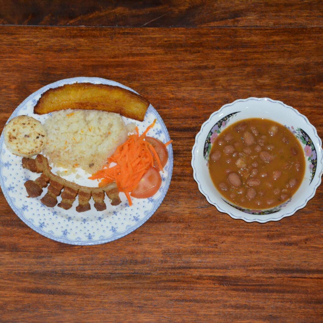 Chorizo de cerdo frito acompañados con arroz, ensalada, huevo, papas fritas, plátano maduro y arepa. Puedes pedirlo con frijoles con la sopa de tu preferencia.
