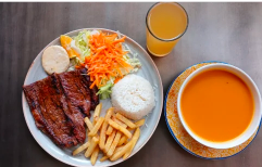 Churrasco de 200 g, arroz, ensalada del día, papas a la francesa, sopa y bebida a elección