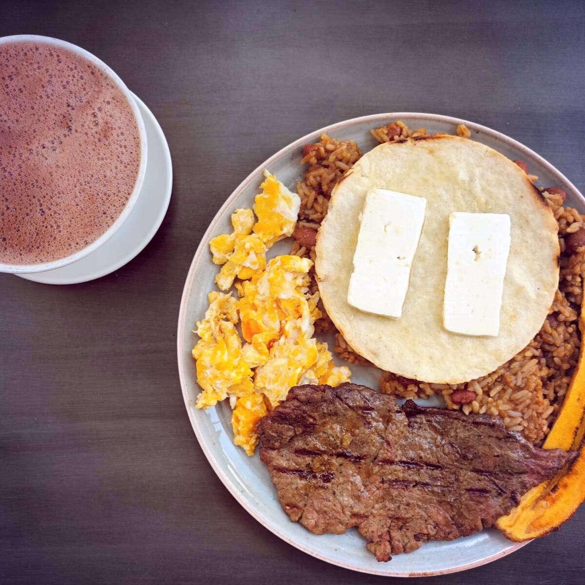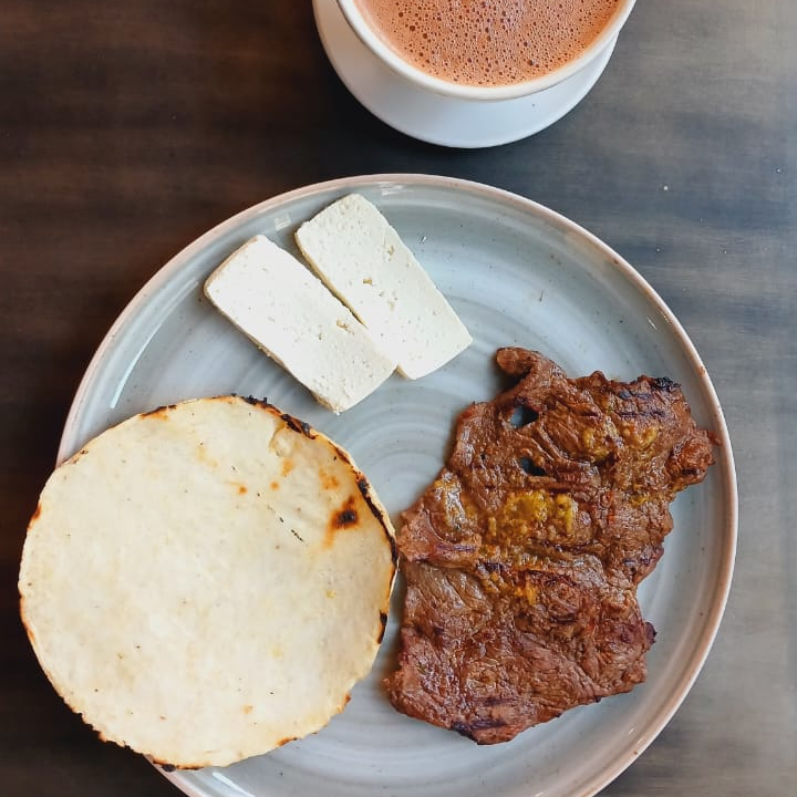 Churrasco de 200 g, calentado de frijol, arepa, mantequilla, quesito, pan y bebida a elección.
