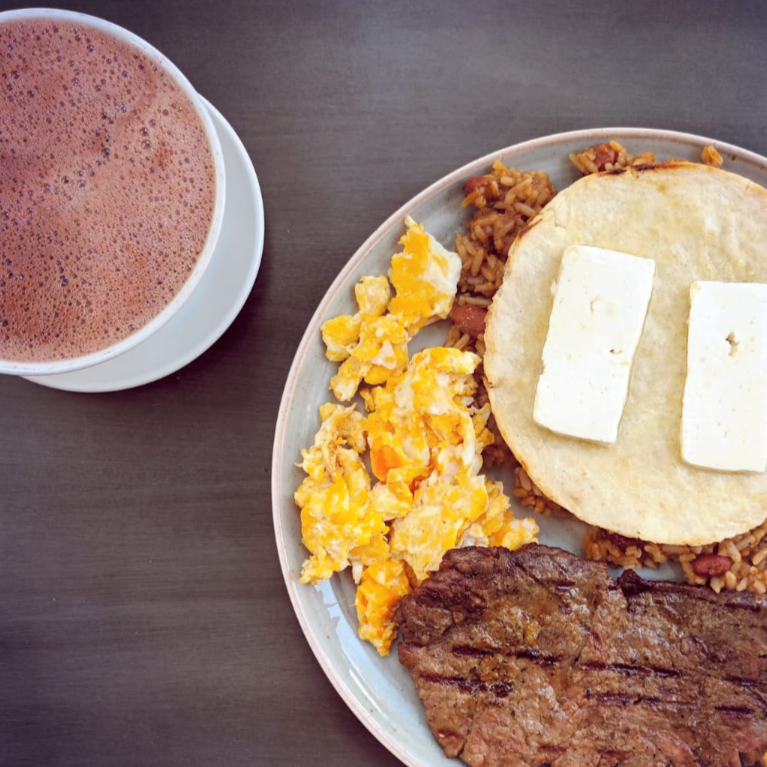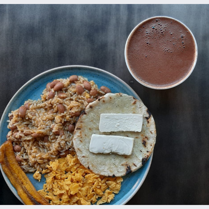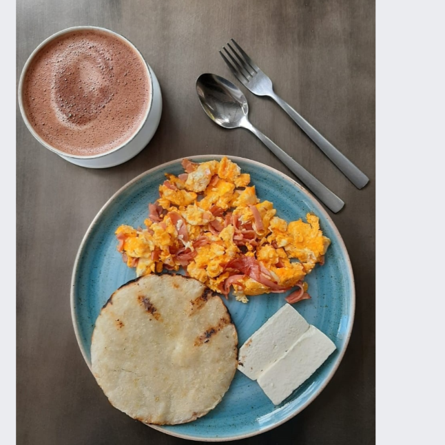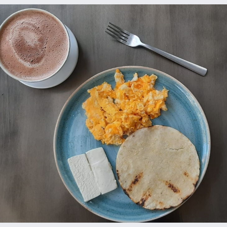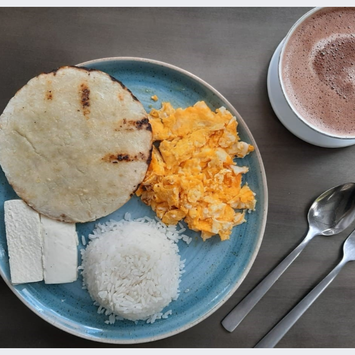 Arepa, mantequilla, quesito, arroz, 3 huevos revueltos y bebida a elección.