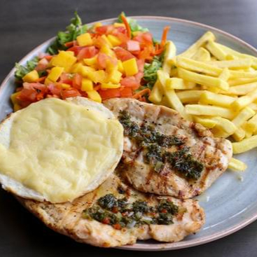 Pechuga de 250 g, ensalada del día, papas a la francesa y arepa con queso mozzarella, no lleva bebida