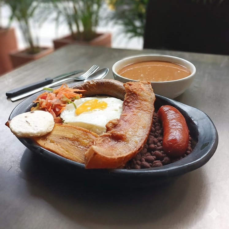 Arroz, frijoles 12 oz, chicharrón 120 g, chorizo 70 g, morcilla 70 g, huevo, ensalada del día, tajada de maduro y guarapo.