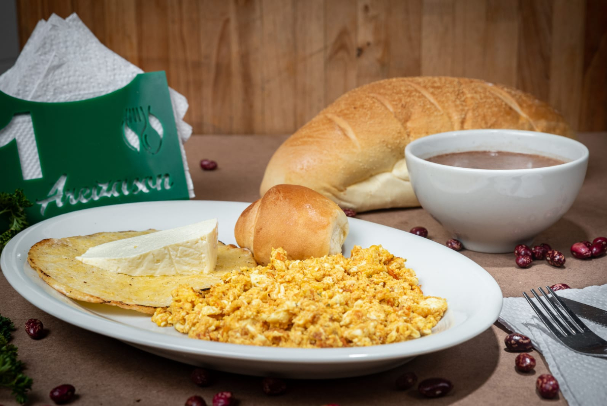 Desayuno personal, 1 arepa con quesito, 1 tajada de queso, 2 huevo revueltos, 1 pan y 8 oz de bebida a elegir, calentado (arroz con frijoles), proteína 100 g según tu elección.