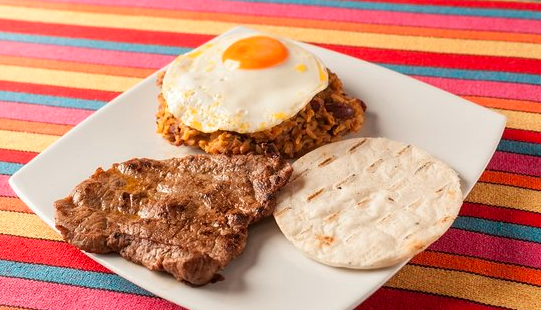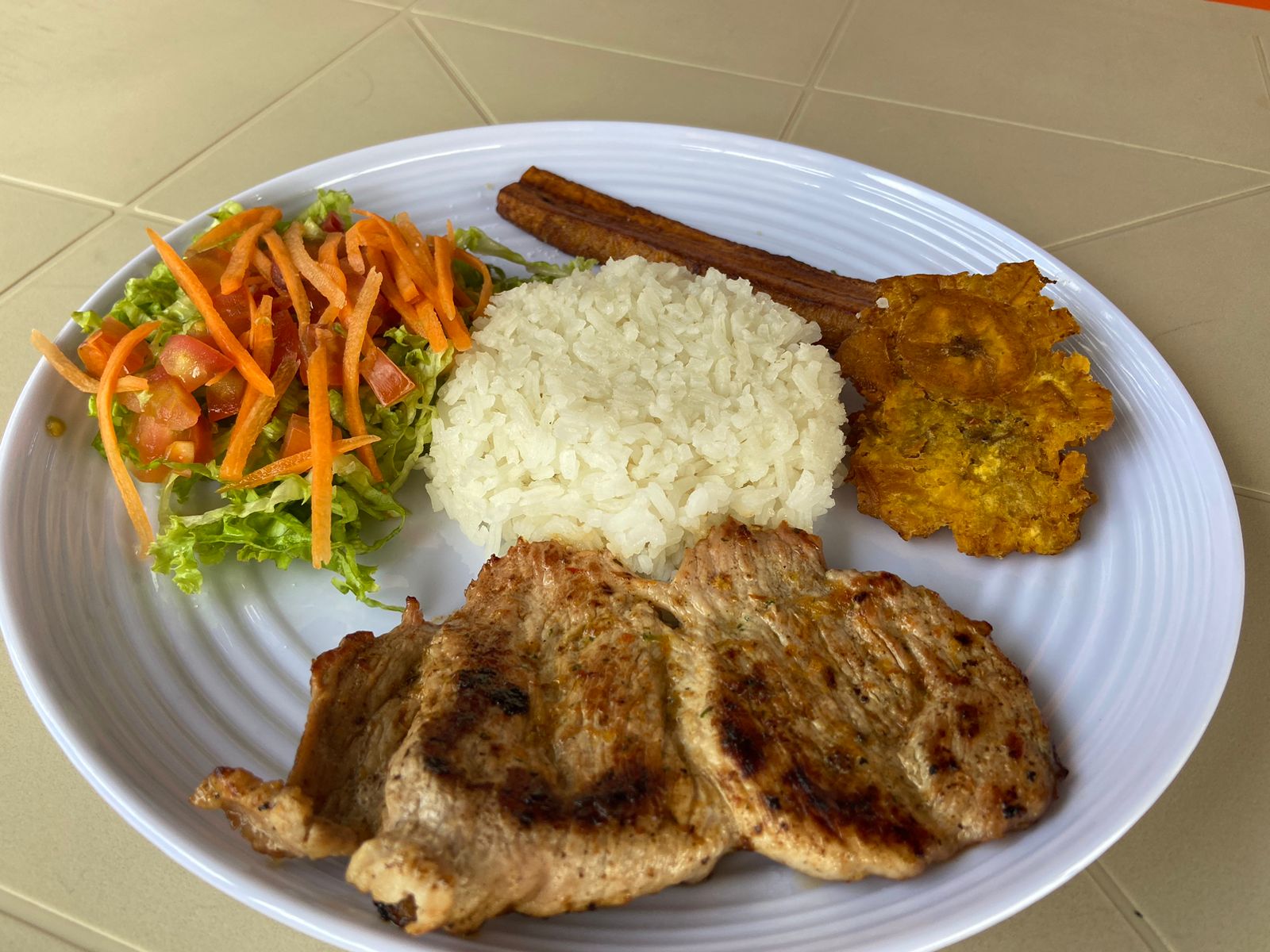 Arroz, frijoles, carne molida, chorizo, chicharrón, ensalada, tajada de maduro, huevo frito